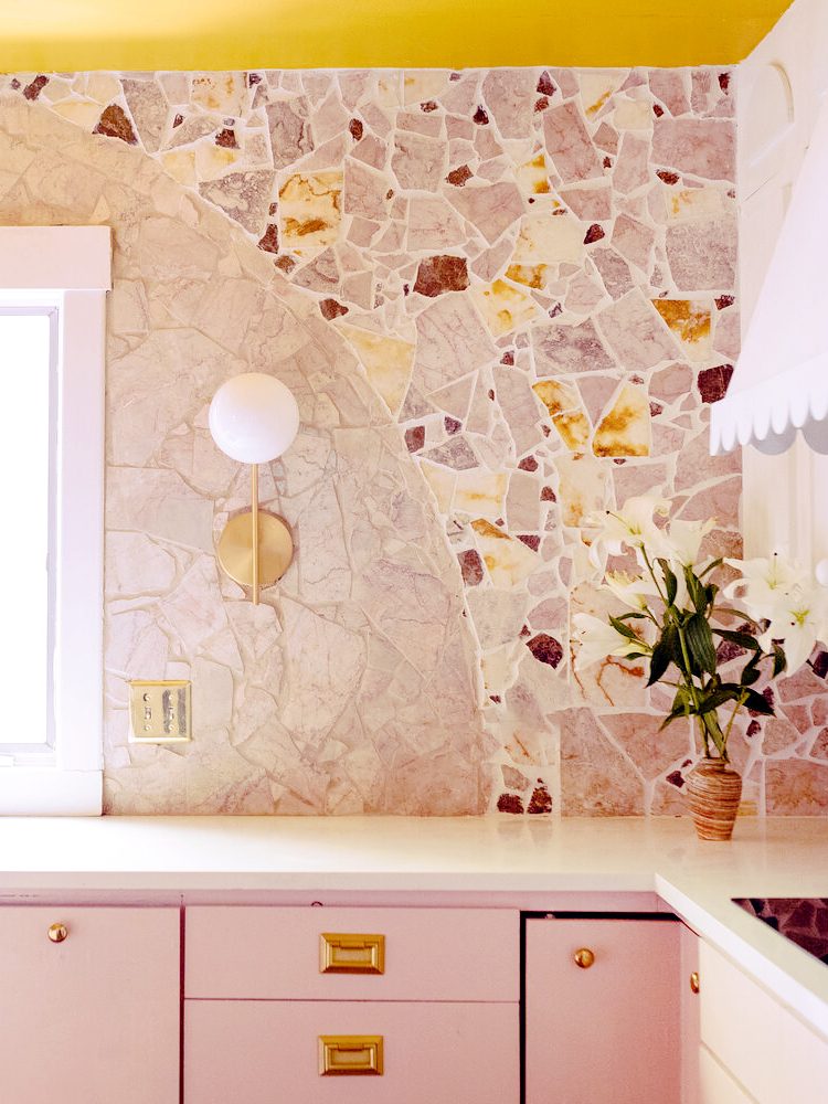 A central arch consisting of smashed-up pieces of pink marble is surrounded by milky white marble, onyx, and Venetian gold marble, giving the 1980s house an old-world vibe. While the weeklong project was time-consuming (Sarokhanian thought about the placement of each slab carefully), she admits it was stress-free.“ Tiling is more of an art than a contractor’s skill,” she explains. Ahead, Sarokhanian walks us through the mini masterpiece.