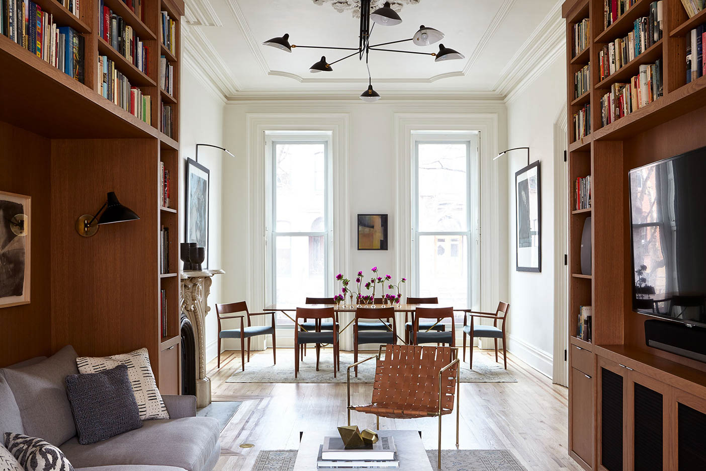 Camilla Gale and Zach Aarons tapped architecture firm BarlisWedlick to rethink the floor plan of their previously dark and dated Brooklyn brownstone, located just a block from Fort Greene Park. A built-in reading nook and dining area flank the central fireplace rather than face it, rewriting what a parlor floor should look like.
