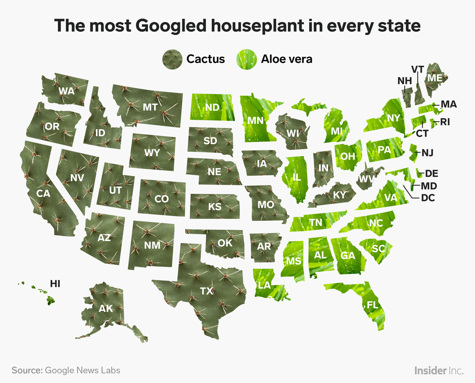Insider worked with Google Labs to analyze search data from the last 12 months, finding two clear winners. What’s more interesting is that, barring a few outliers, the plant preference is split almost perfectly by coast. The East Coast has a thing for aloe, while the West Coast is all about cacti. Cactus plants are marginally more popular, with 27 states claiming them as the most-searched houseplant.