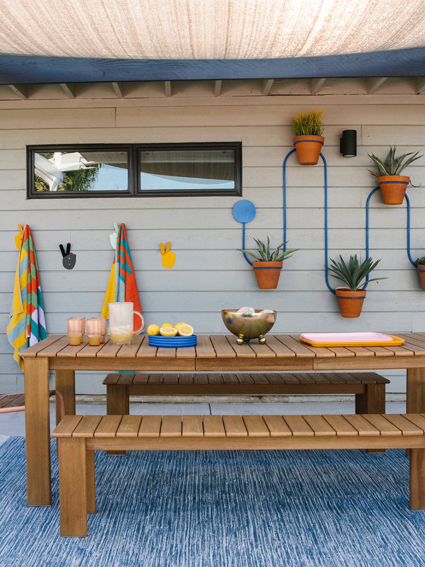 After the construction of her small pool was complete, Los Angeles–based writer Camilla Blackett peppered in banana-leaf palms, which double as a curtain for a nearby outdoor shower and deliver major jungle vibes.