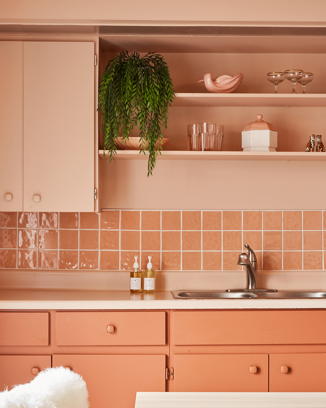 Brown and Sklash found salmon-colored square tiles at Home Depot Canada that were just over $2 per square foot. “The organic texture made them look way more expensive than that,” says Sklash. They loved the product so much they ended up using them in the residence kitchen backsplash and the double room bathrooms. Then came the grout. “The first one we used was a dark charcoal color, and it was a bit of a failure,” recalls Brown. Redoing the lines in a crisp white gives it a contemporary spin, ensuring the tile looks like it’s from 2021, not 1981.