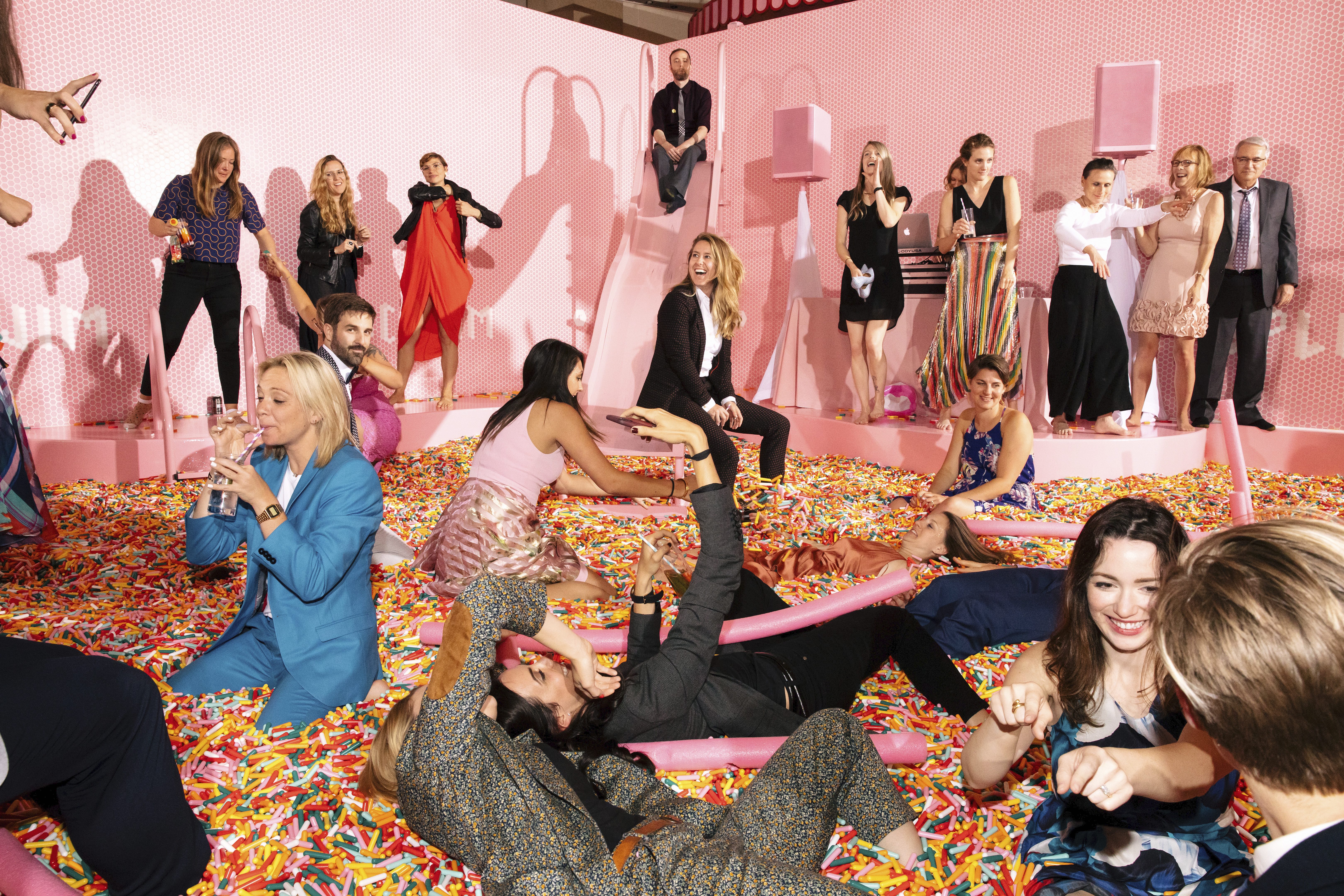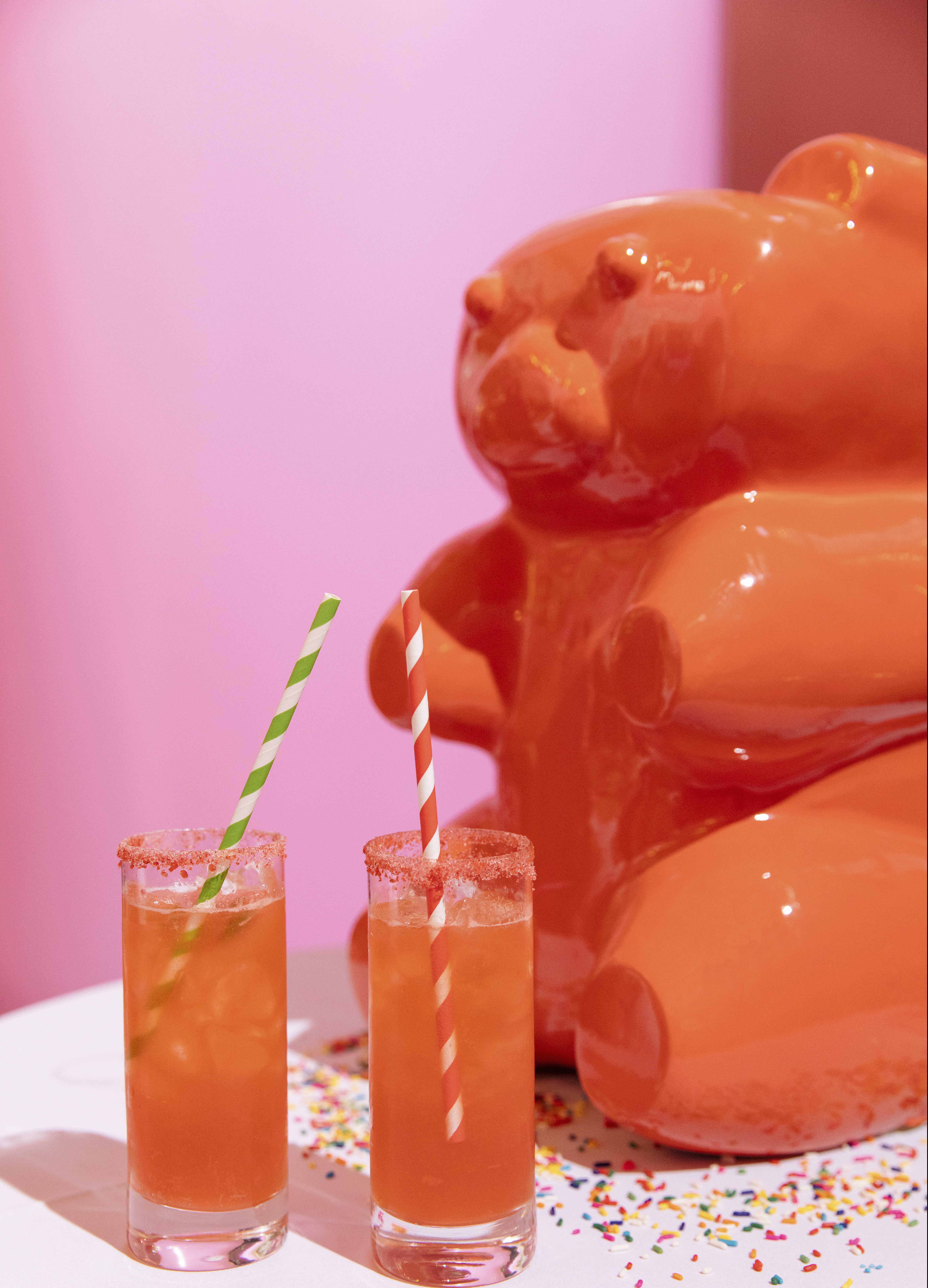 The Museum of Ice cream, where the reception was held, already has tons of baked-in fun—such as this 490-square-foot pool filled with two-inch rainbow sprinkles—so the brides only had a few decisions to make. They designed the bar signs and added five-pound Gummy Bears (yes, they’re edible) as table decorations and chose a Birthday Cake from Milk Bar, because, says Sydney, “we’re obsessed with it.” And to honor the date, they worked with Stag Dining to create several memorable cocktails named with Pride month in mind, such as the Pride Paloma.