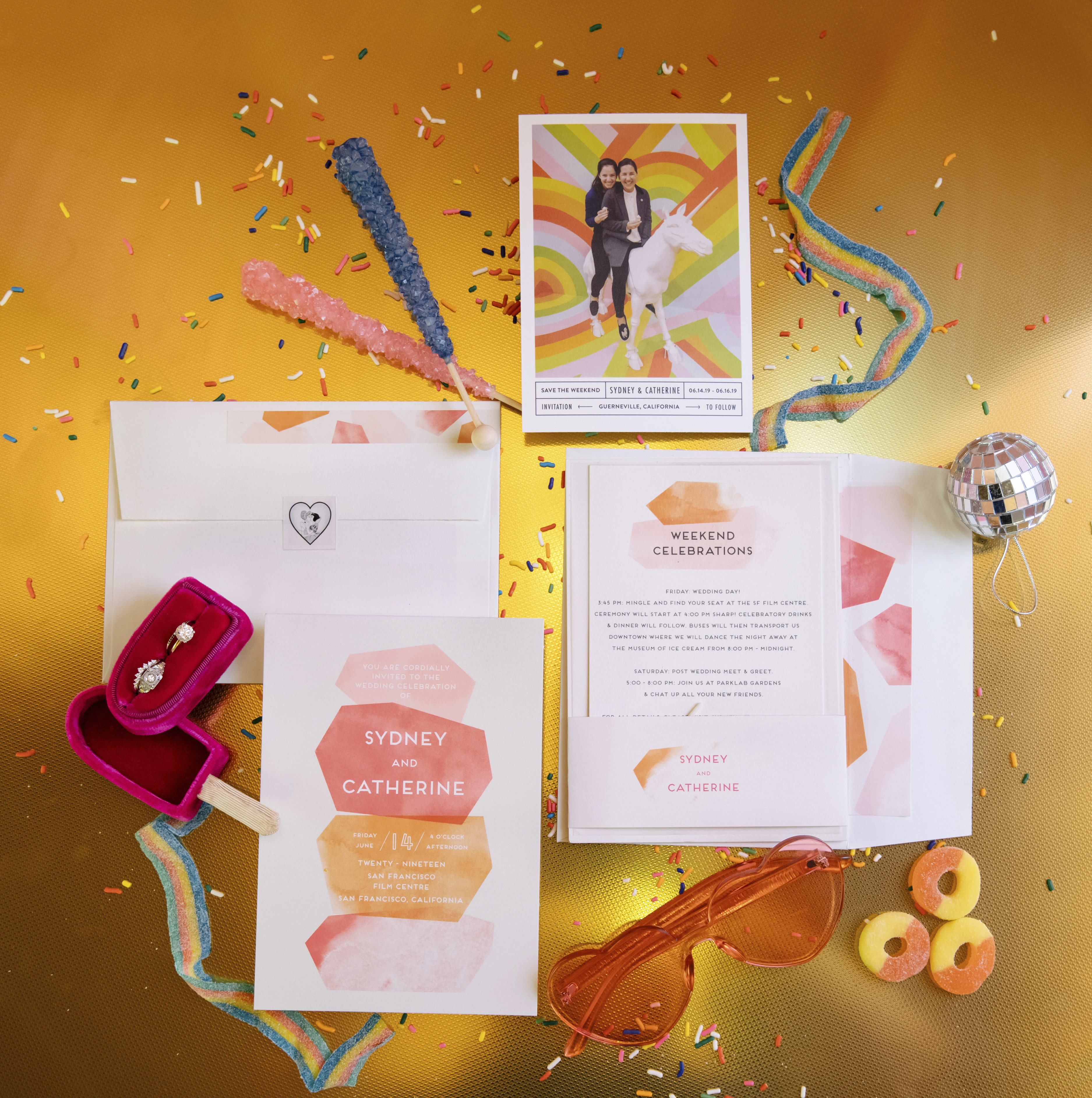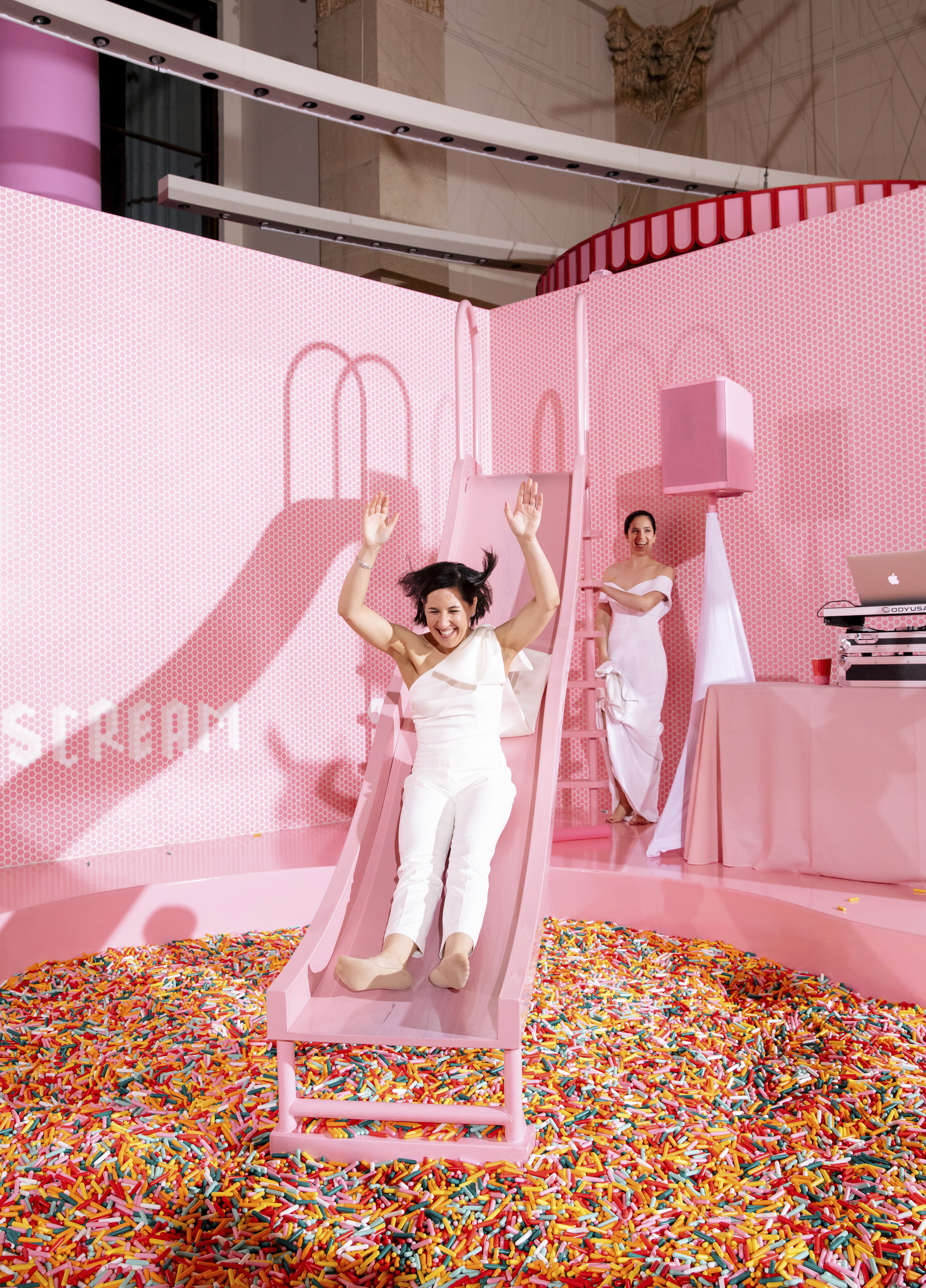 Still, with weeks to go and 200 people on the guest list, the couple scrambled. They landed on the San Francisco Film Centre for the ceremony and dinner, and then they dreamed up the cherry on top: a reception at the Museum of Ice Cream, a VIP venue that typically only a celebrity could score. How did they make it happen? They enlisted two sets of extremely determined parents, particularly Sydney’s mother, who wrote the museum a heartfelt letter insisting that this was the perfect first wedding for the museum—an LGBTQ+ affair during Pride month in San Francisco. The museum enthusiastically agreed, and both brides felt like Beyoncé.