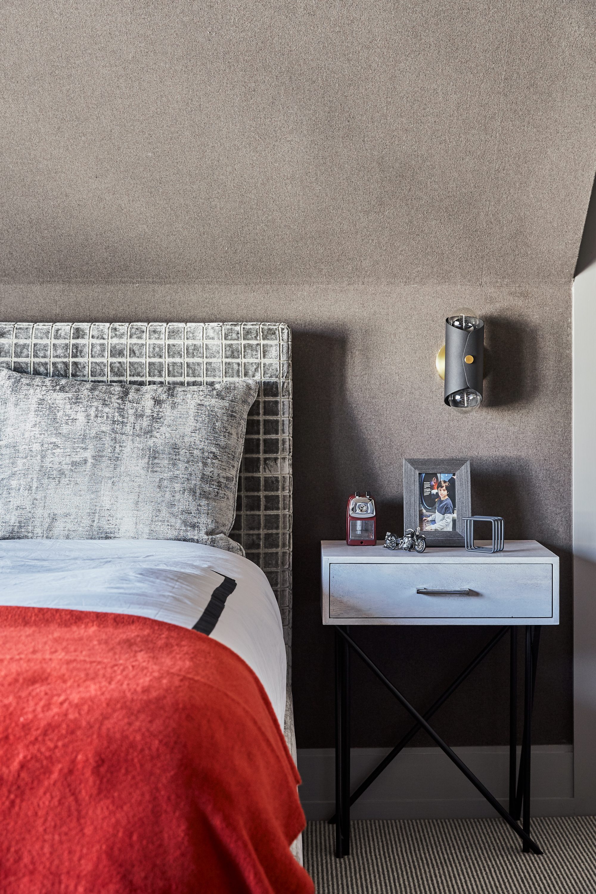 Kraiem wanted Eli’s room to look streamlined and sophisticated, so she dialed up the design by experimenting with different textures. She created a “boy’s cave” effect by placing brown wool wallpaper on the walls and ceiling. A velvet grid-print bed frame, cotton throw pillows, and a bench draped in an embroidered stripe round out the look.