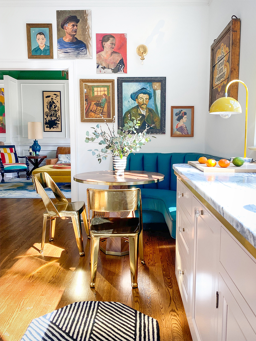 Sourced from an estate sale in Chicago, the mid-century modern banquette, once covered in a “stained-up, sticky orange vinyl,” is now swathed in a wipe-able (read: kid-friendly) faux leather. To complete the booth area, Papier devised a gallery wall made up of portraits, starting with the blue-toned man now positioned underneath the sconce. “We call him Jacques-Pierre,” says Papier. “He looked a little lonely up there by himself at first, but now he has plenty of friends to hang out with.”