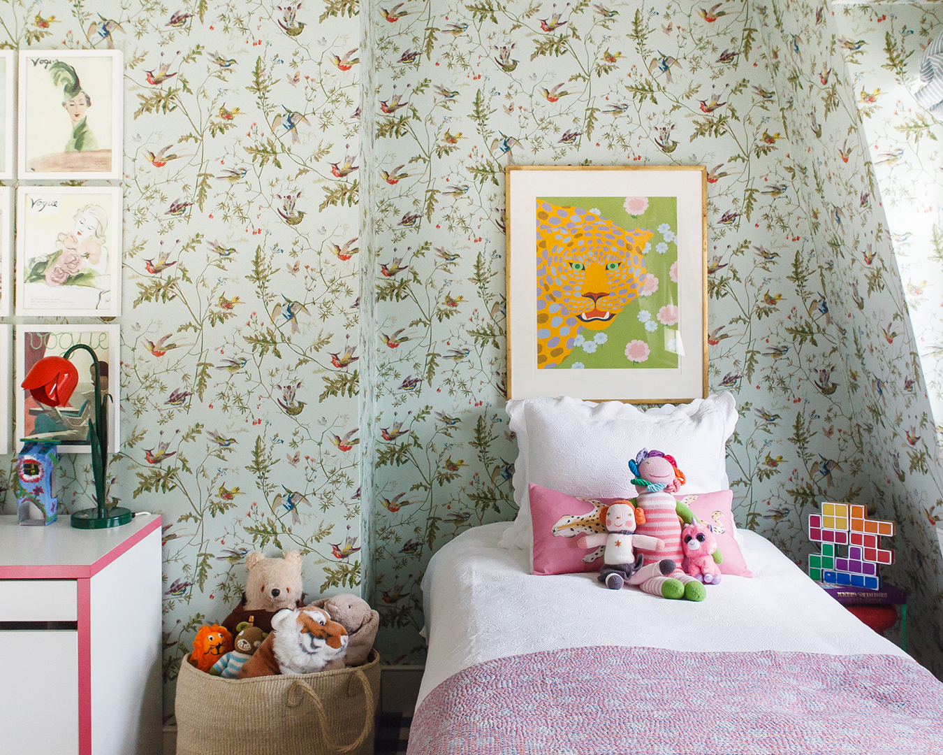 From there, functionality became the dominant design force. Knowing how fickle little ones can be, Tredgett employed a few tricks to ensure the room offers versatility should her youngest client decide to get creative with the layout down the line. Instead of committing to a headboard, she used a vintage framed print to mark the bed (turns out Tredgett’s hunch was right—the bed has since moved locations several times). She also made a gallery wall, with colorful photocopies of vintage magazine covers placed in affordable IKEA frames that can be swapped out over time.