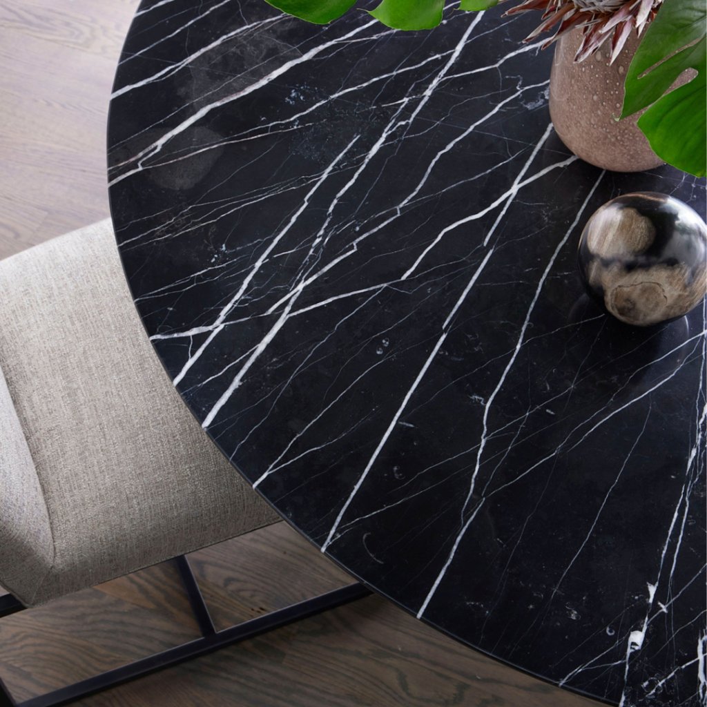 The ultimate conversation piece. For something sleek, skip the standard four-prong legs for a dining table with an X-shaped metal base. On top, white-veined Italian black marble, new to MG+BW’s library of materials, serves as a focal point.