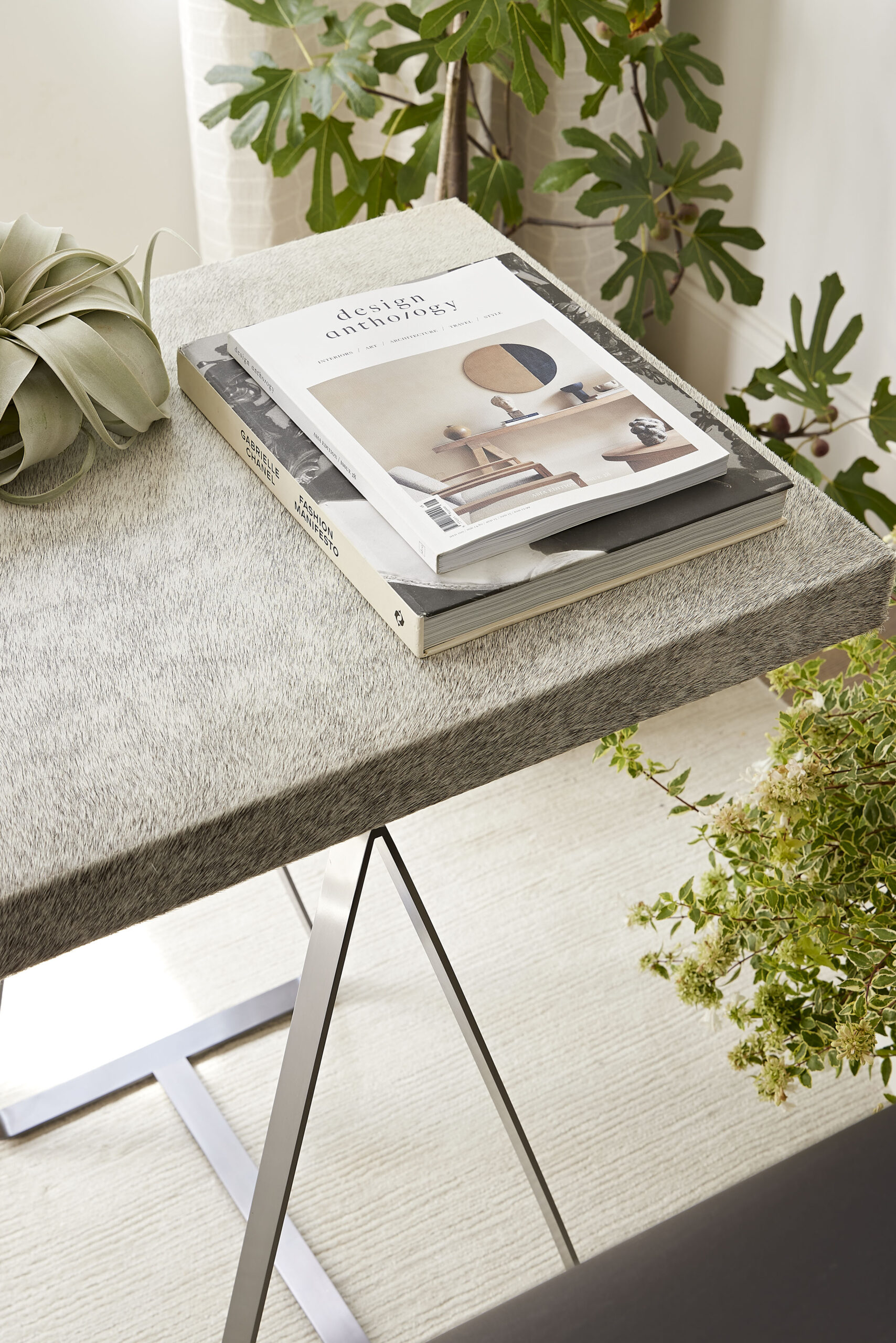 Elevate your entryway, home office, or living room with this innovative take on the trestle table—a dual-purpose piece that can be used as either a console or a desk. The legs, which are available in two finishes—brushed brass and pewter—provide a cool contrast to the textured hair-on-hide top.