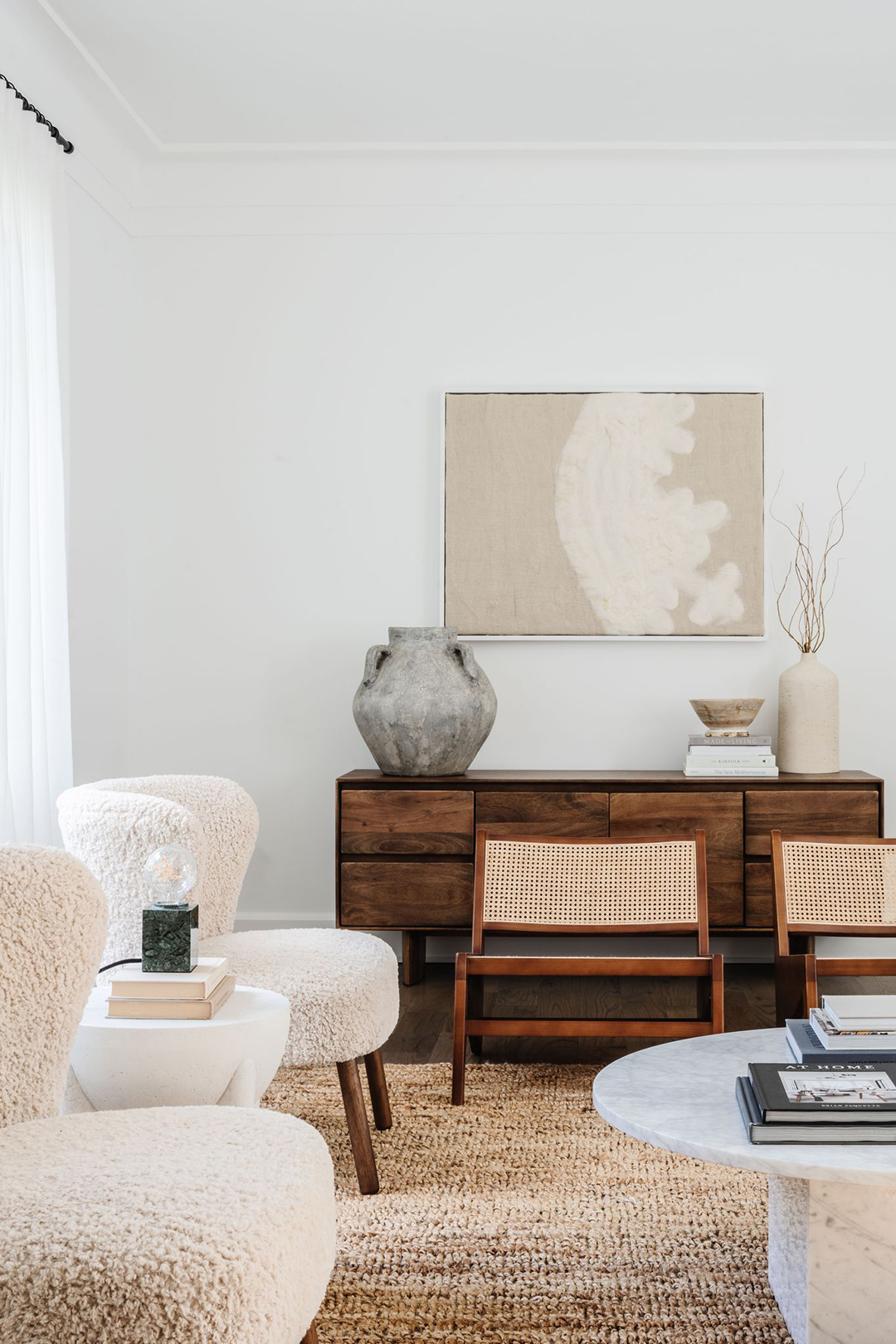 While seemingly inspired by Viggo Boesen’s Petra chair (which typically retails for upwards of $6,000), the equally cozy Zara Home armchairs were a fraction of the cost at $330 each. “Even though they’re neutral, the terry cloth differentiates them from the other pieces,” says Santos. The designer repeated the chunky nature of the upholstery by opting for a thick jute rug from Target’s Studio McGee collaboration.