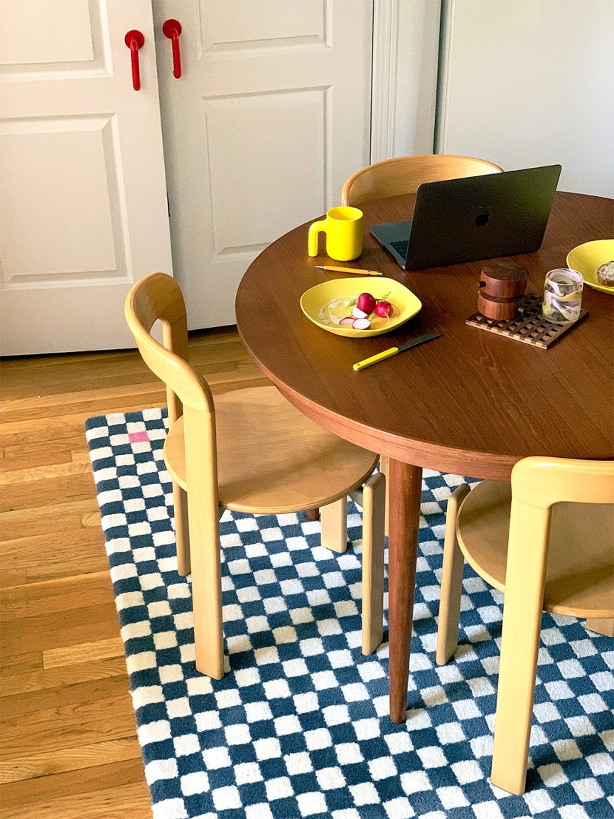 “Our dining table set is the first thing you see when you enter our apartment, and generally it’s cluttered with mail and projects. But now, it’s become our new office; it’s only filled with the essentials, like a laptop, a notebook, and our coffee cups. We have a vintage mid-century Danish teak round table and 1970s beechwood Bruno Rey ‘Rey’ chairs.” — Meghan Lavery-King, Cofounder of Home Union