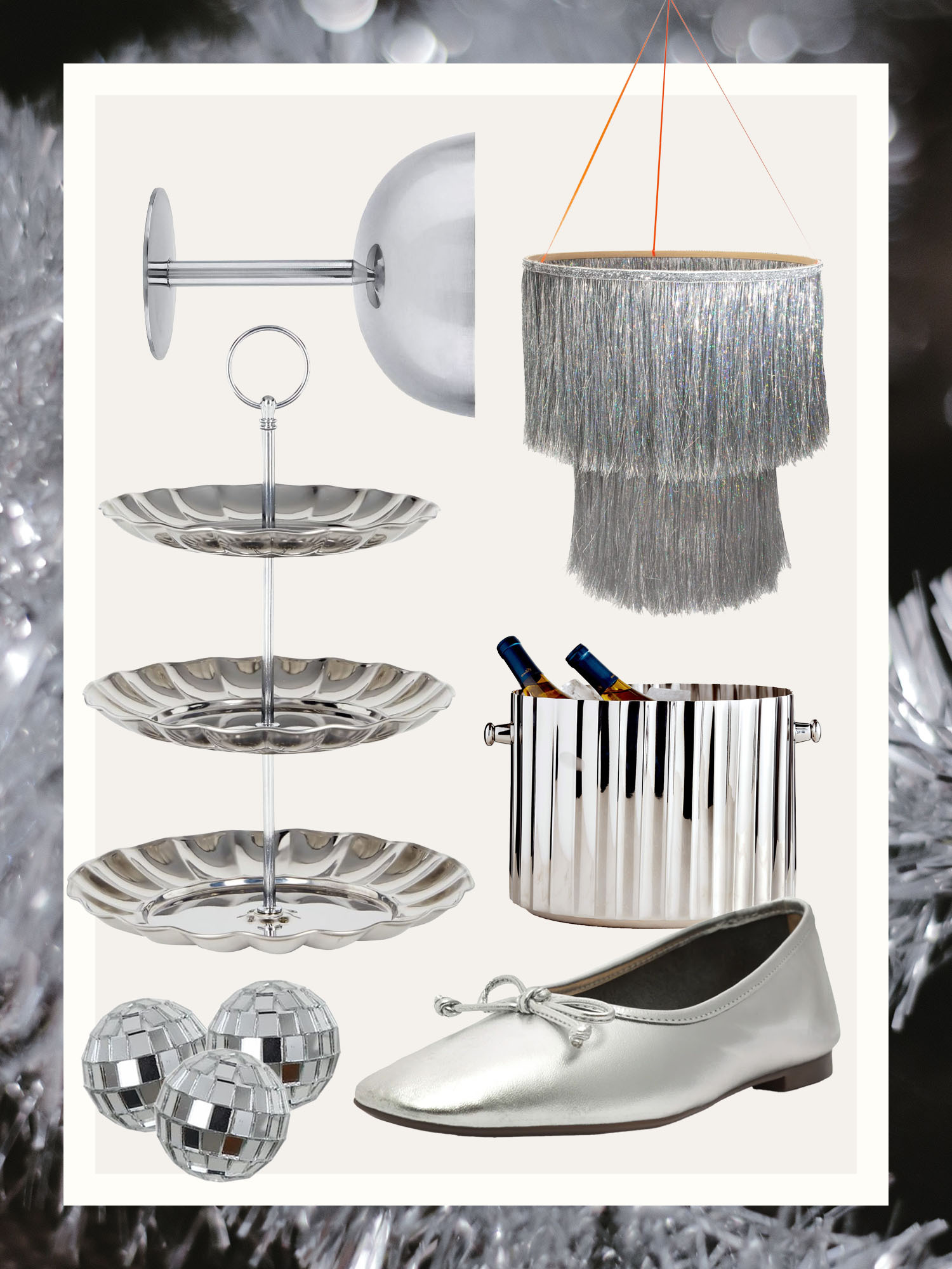 Restaurant supply-inspired serveware, faceted champagne buckets, and lustrous taper candles can take a holiday spread from chaotic to refined. But if you’re really committing, you’ll need your outfit to follow the theme. Think: a reflective handbag, glittery eye shadow, and silver ballet flats. Now you’re really starting 2024 on the right foot.