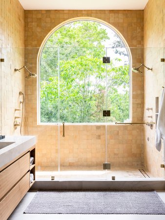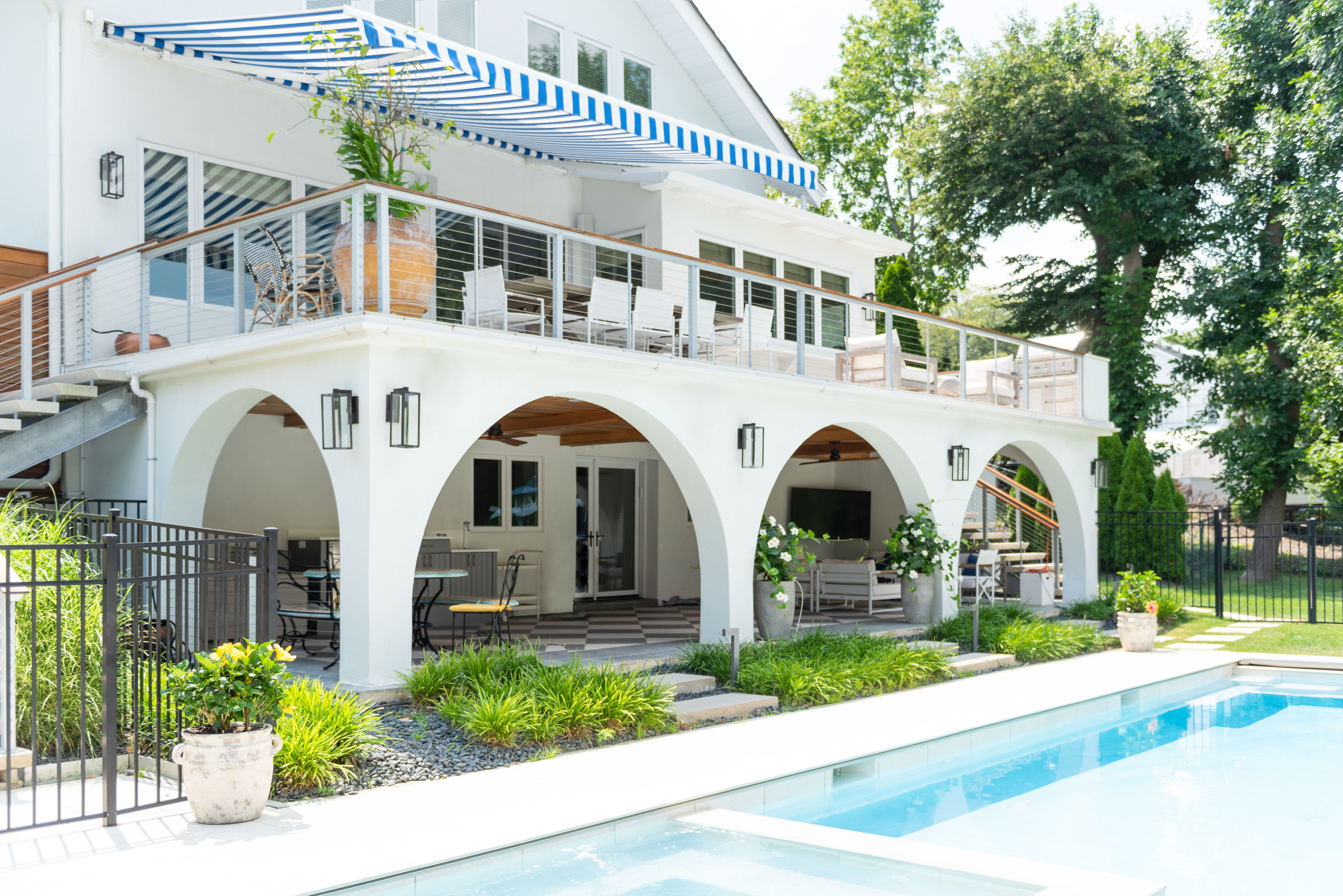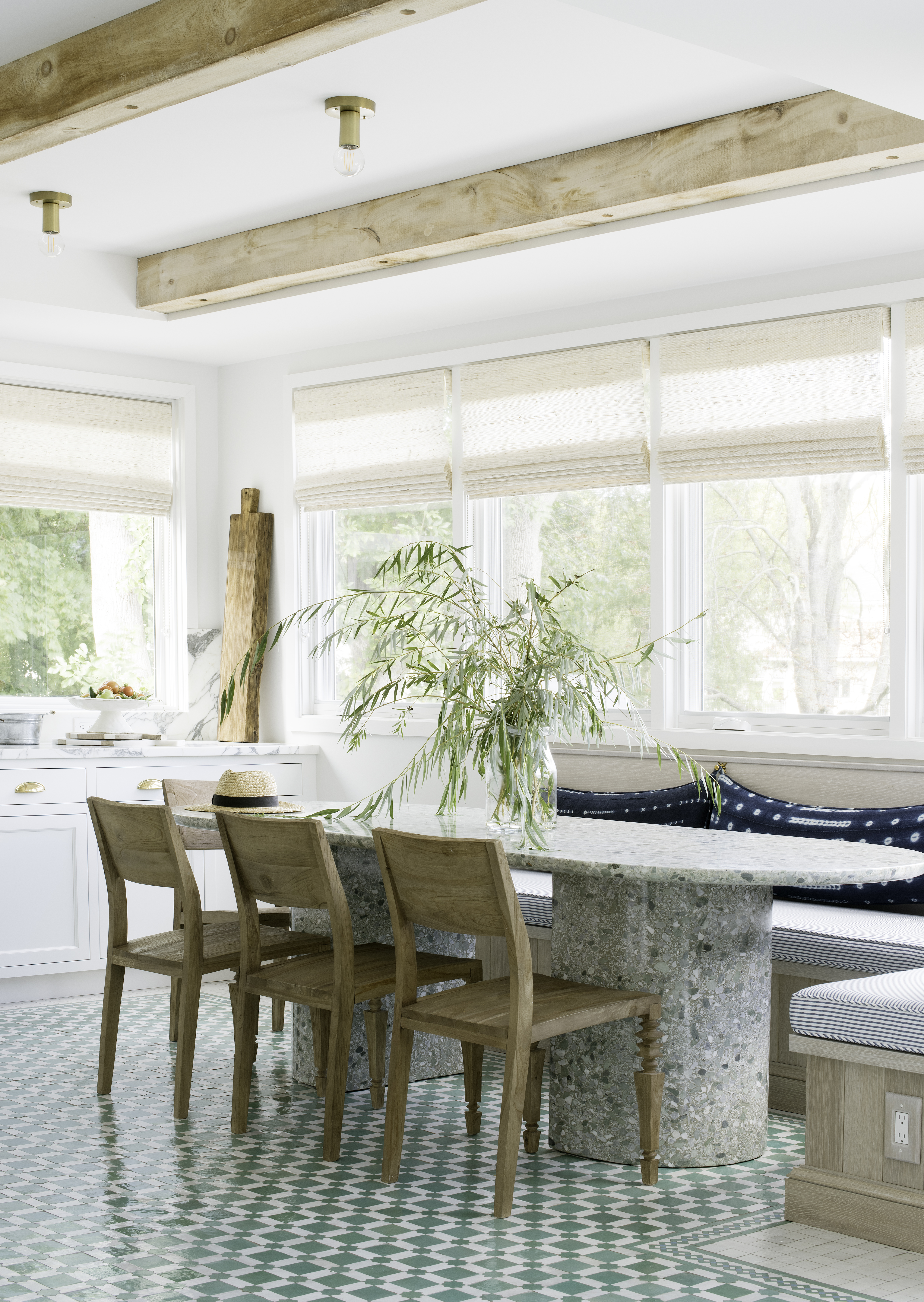 Overall, the designer wanted to create a practical, laid-back home for a growing family of seven—no easy feat! That meant a spacious kitchen with multiple gathering spots (it’s where they spend most of their time) and maximizing the house’s backyard. “The family loves to cook and entertain, so we added multiple outdoor living spaces: a lower and upper deck, as well as a pool and firepit,” says Cohen. “They wanted a fresh, happy, family-friendly space big enough for hosting large parties.” With these clever tile moments and the sturdy custom furniture, the home is now exactly that.