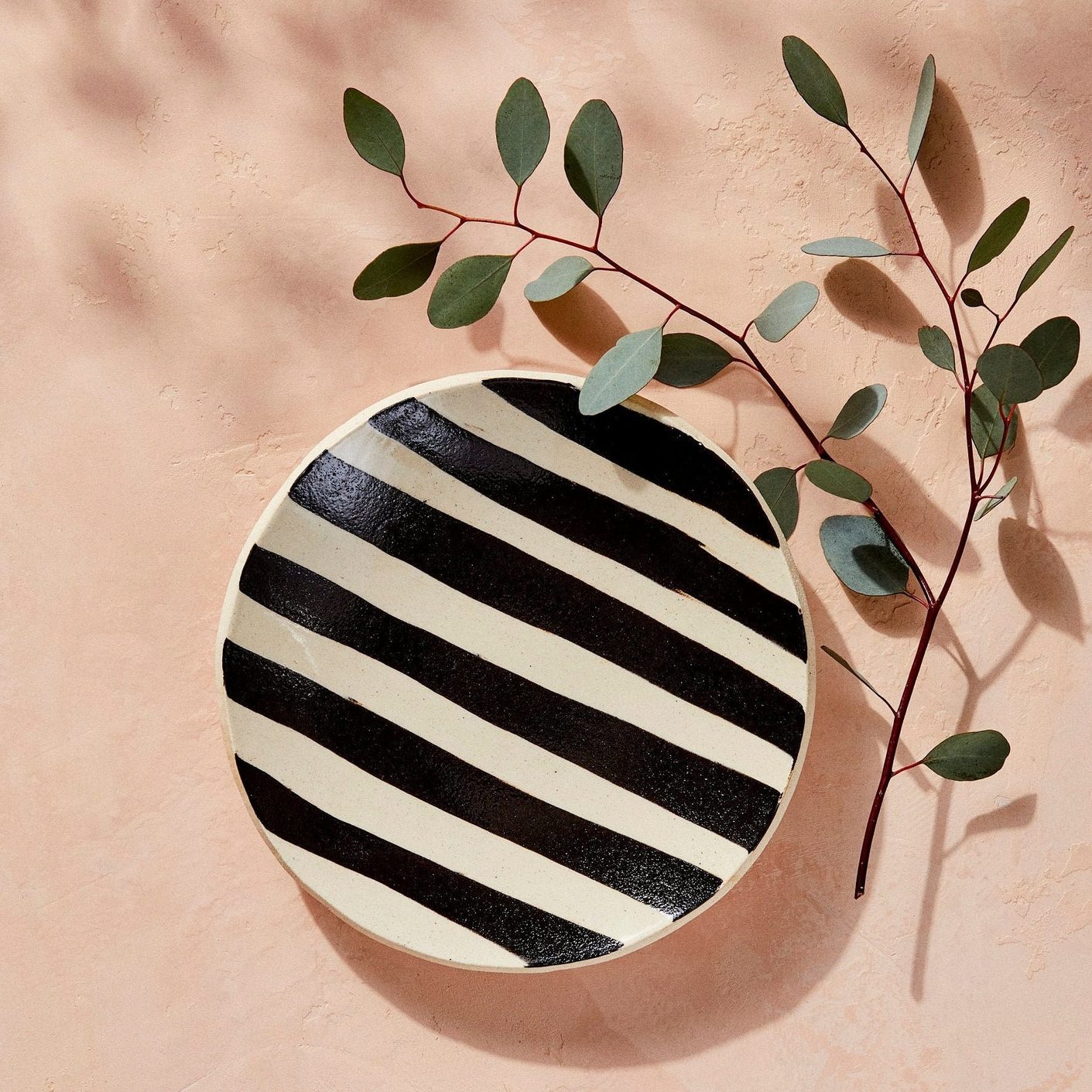 First up, an elongated catchall featuring flecks of jade and blue that’s an ideal spot to drop keys and sunglasses in an entryway or corral face oils atop a bathroom vanity. “I just like everything to have a place,” says Richie. She also worked with Reinhardt to make a small maroon-hued platter for dainty earrings and necklaces, as well as a black-and-white–striped tray that would stand out on a bar cart as a holder for cocktail-mixing accoutrements.