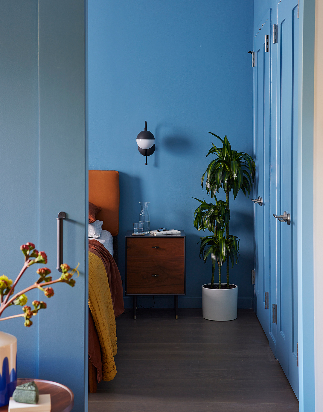 Blair ensured the owner it was just paint—he could change it the second she left if he wanted to—but the shade ended up being the jumping-off point for the rest of the apartment. All of the bedroom’s closets, an accent wall, and the sliding barn door connecting the two rooms are swathed in a similar hue, Blue Ivy by Clare, for a subtle contrast.