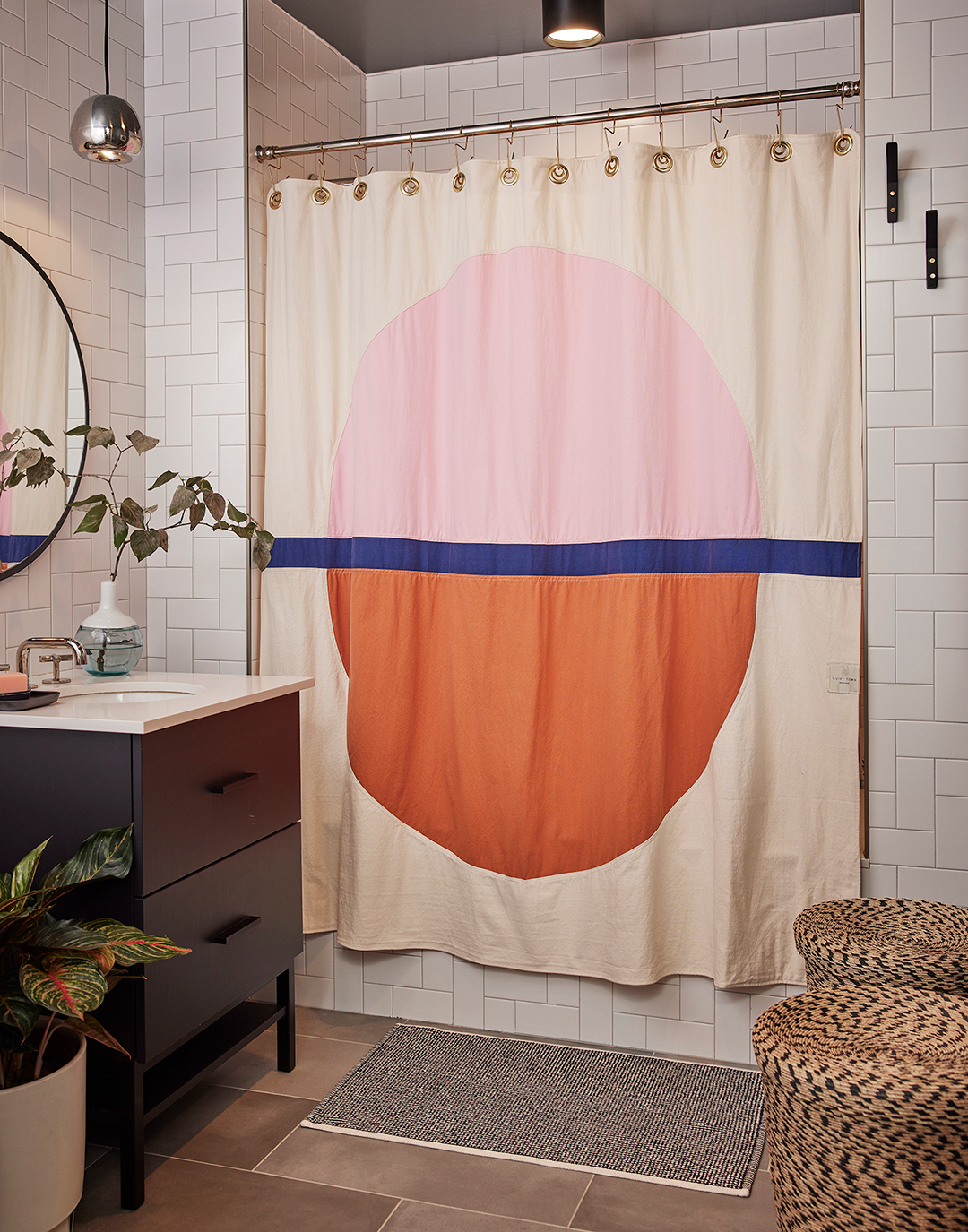 Blair wasted no time introducing him to other palettes. To warm up the cooler shades in the bedroom, there’s now a leather headboard, terracotta sheets, and marigold coverlet (the shades tied together all the wood tones of the owner’s existing furniture). Even the bathroom got in on the fun with a shower curtain in sunset shades and an easy lighting swap—the designer trading the pendant’s previous glass globe for a mood-setting chrome one.