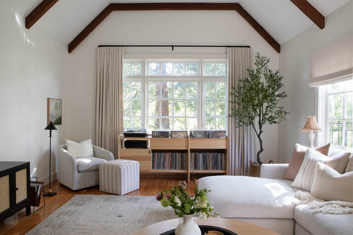 Scattered around the living space were the remnants of a bachelor pad: shelves piled with vintage records, curtain-less windows, and so many different shades of dark wood. Simply removing all that furniture lightened things up considerably. To brighten the room even further, Thomas brought in almost exclusively soothing neutrals, from a tone-on-tone gray rug to white bouclé armchairs. The ceiling beams, however, retained their natural finish for some contrast.