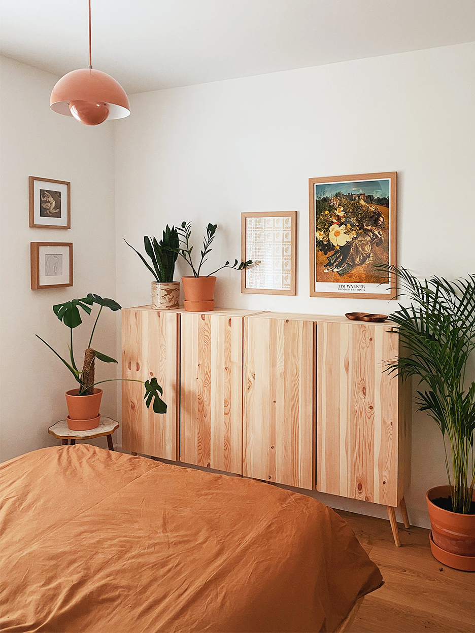 Inspired by a woman named Emily Wheeler, whom she found on Instagram, she’s also tiptoeing into biophilic design. “It’s all about connecting with nature and using natural fabrics, neutral colors, and plants,” explains Hasan. She’s now the proud parent of around 40 greens, and after some trial and error involving a few drowned cacti, she’s settled comfortably into a nonroutine: “I remember one of my friends saying, just stop caring about them and they’ll do better,” she says. “A lot of plants actually tell you when they’re thirsty—the leaves will go limp and they’ll start curling up. I just stick my finger in the soil to see how moist it is and go from there.”