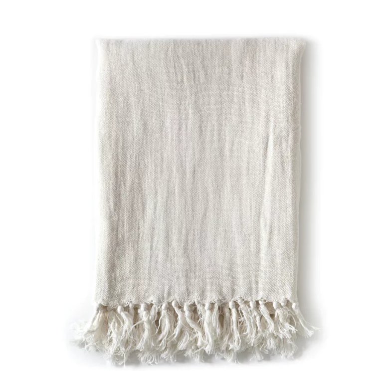 For the coastal grandmothers out there who catch a draft no matter the season, this one’s for you—a crisp white throw made from organic linen is the perfect wrap for balmy breezes.