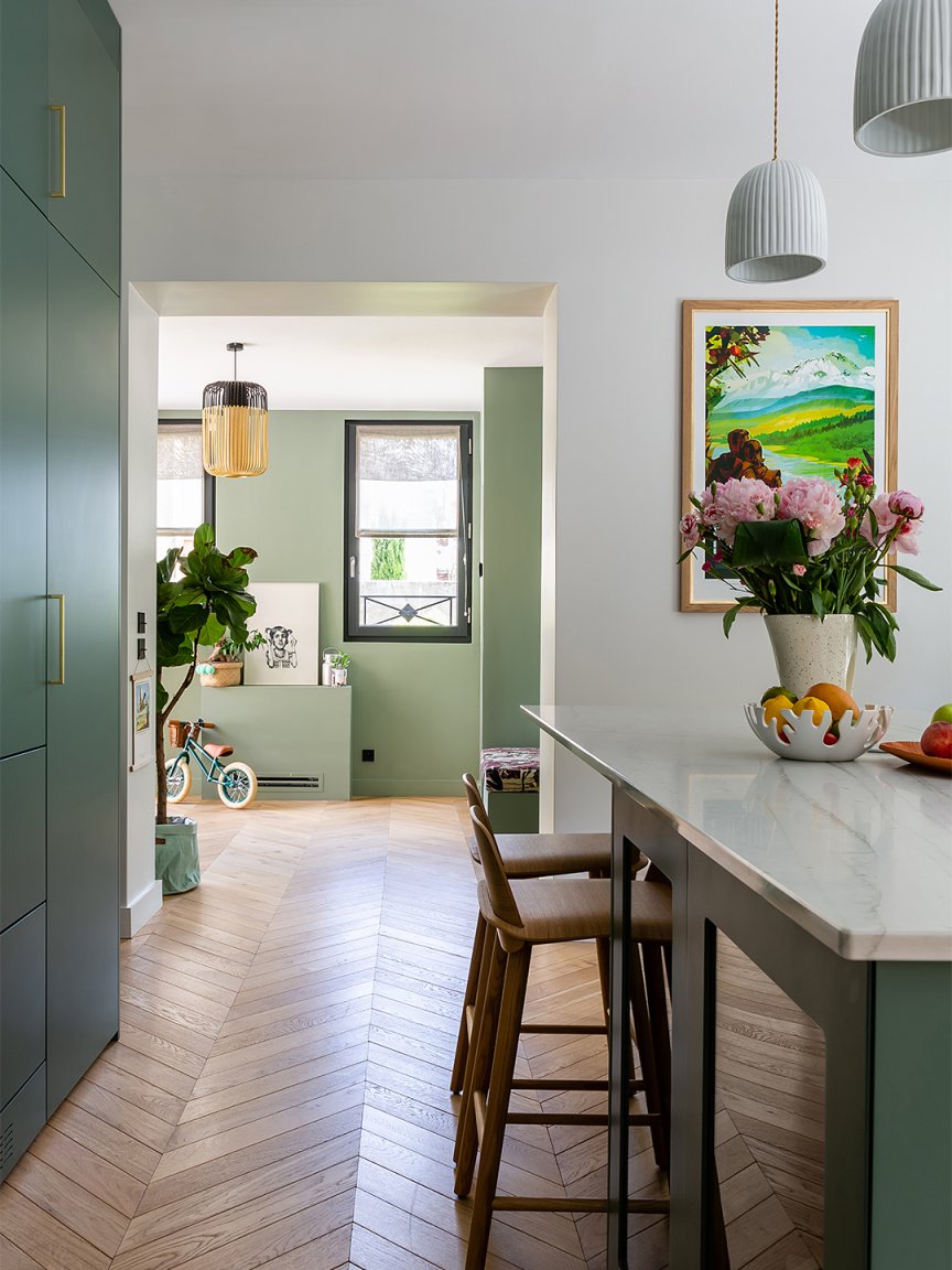 When paired with black and white ceramic tiles and brass hardware, this hue reads as retro-cool (Chris and Claude Co. used the shade in its ’60s-inspired home reno).