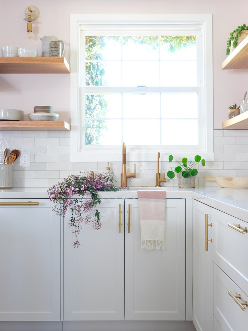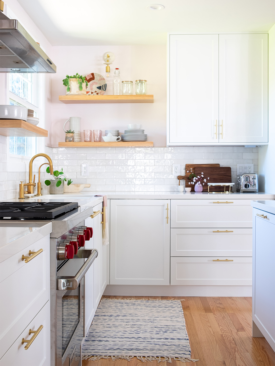 The glossy, earthy white subway backsplash Gutierrez landed on only looks expensive. The Bedrosian tile cost $7 per square foot. To really stretch their budget, the designer only took the feature up to the open shelves on either side of the stove.