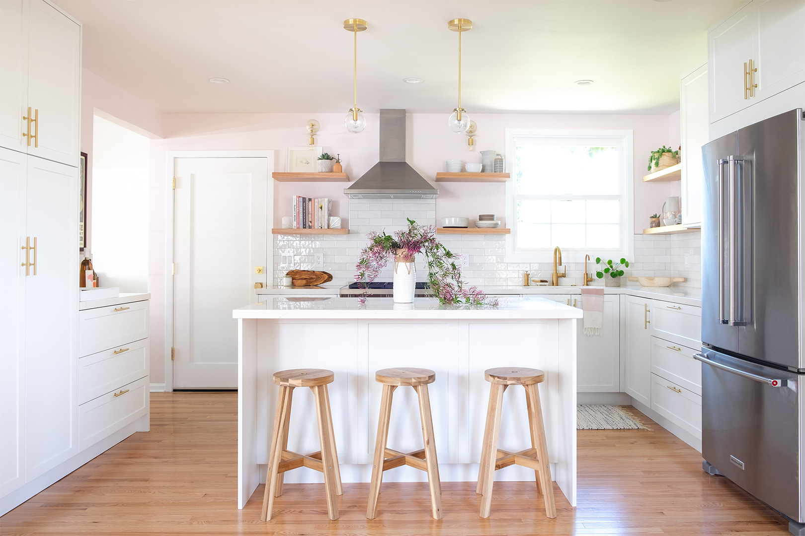 Designer Gina Gutierrez, of Gina Rachelle Design, drew up seven different kitchen layouts for her client, Lisa, an aesthetician living in the Bay Area, before settling on the right one. The part they kept getting stuck on? The supporting wall that divided the 150-square-foot space and the living room. Gutierrez played around with the idea of a partially open floor plan with a peninsula, among other arrangements, but when the homeowner gave her the green light to spend a little more, the choice became clear: They would call in a structural engineer, install a beam, and open everything up.
