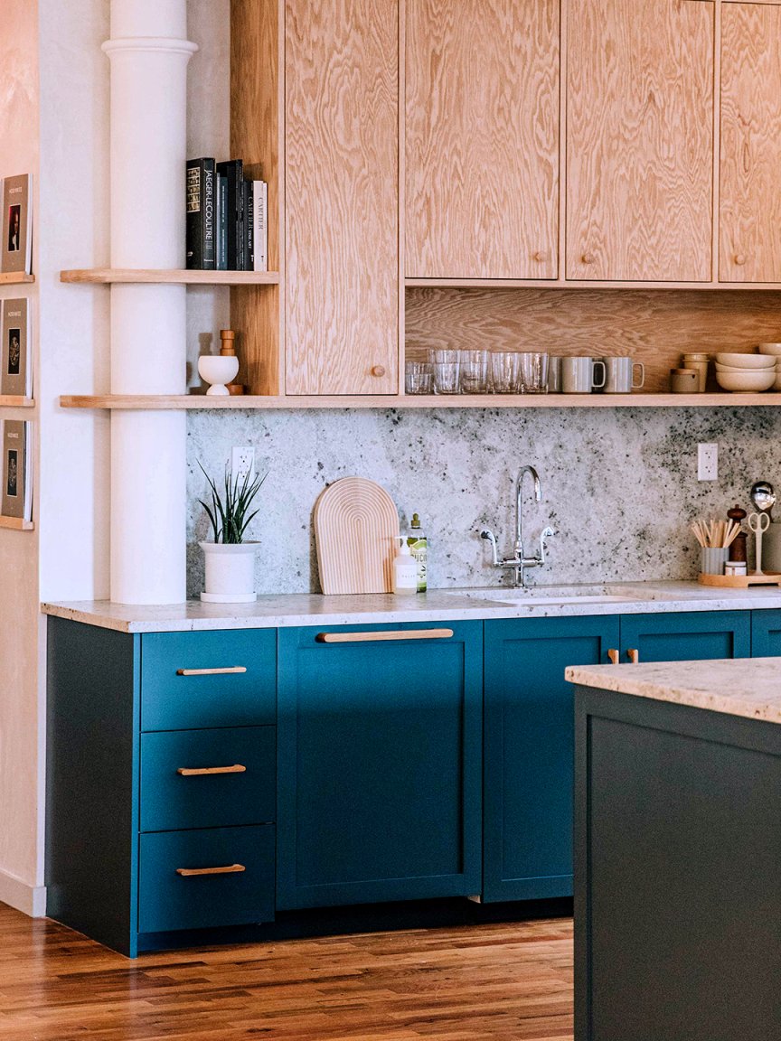 “We knew this column was going to interfere with the kitchen,” says Mangini. “We wanted to showcase it instead of boxing it up with some drywall.” So they decided to use it as an opportunity to create an open shelving moment that extended past the cabinets—and right through the pole. The idea was simple enough, but the execution was a whole other ordeal.