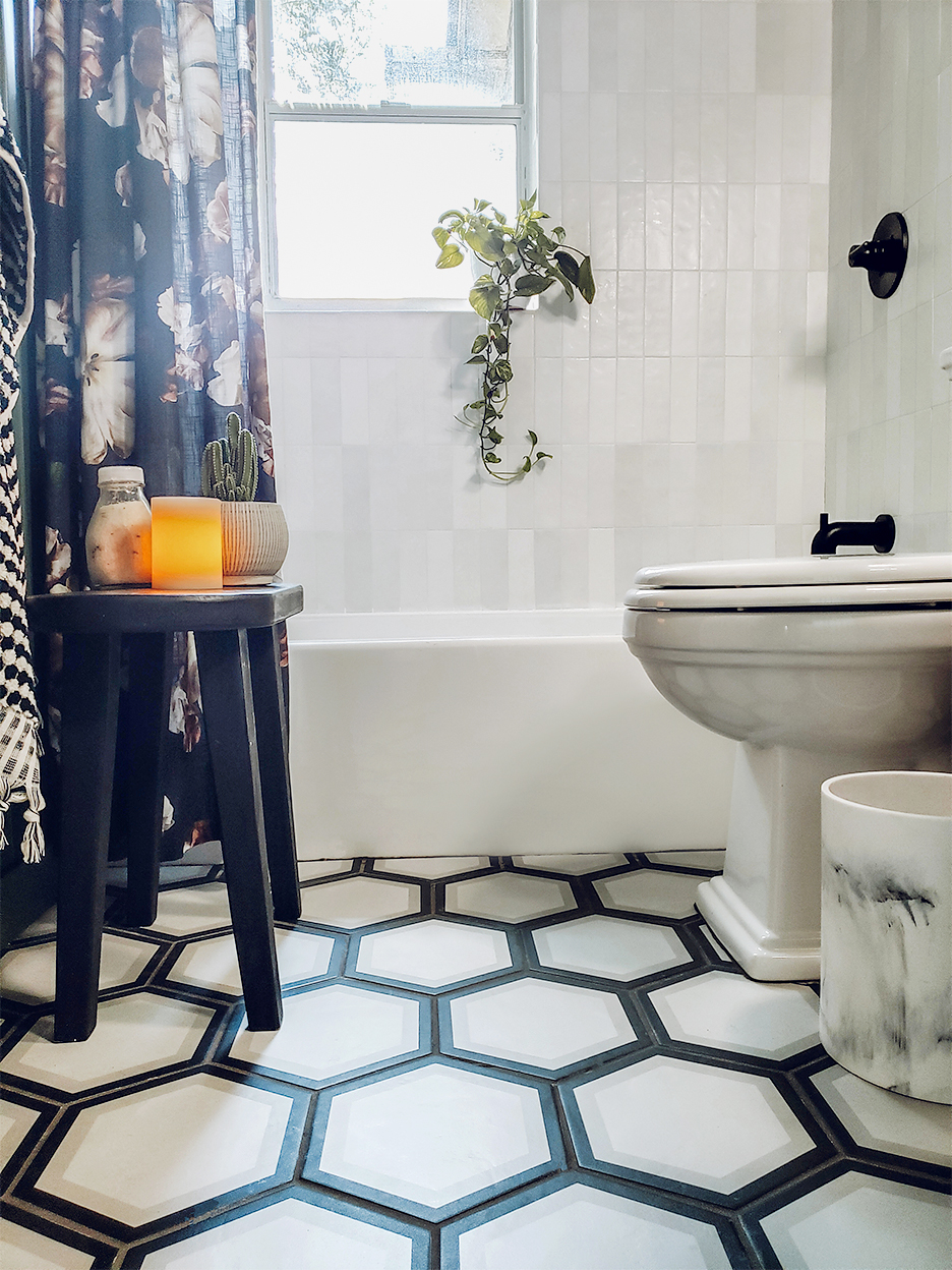 To make the bathroom feel taller, we paid a contractor $500 to stack the tile in the shower vertically until it reached the ceiling. We laid the hexagonal flooring ourselves, though. We thought the shape was going to make the install super-challenging, but we quickly figured out a trick: We cut the pieces that border the room in half to give ourselves a straight edge to start with, then worked our way toward the center of the floor.