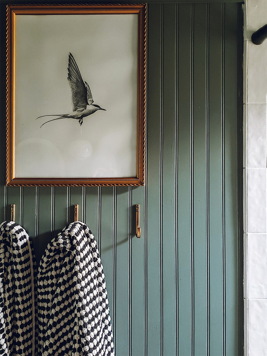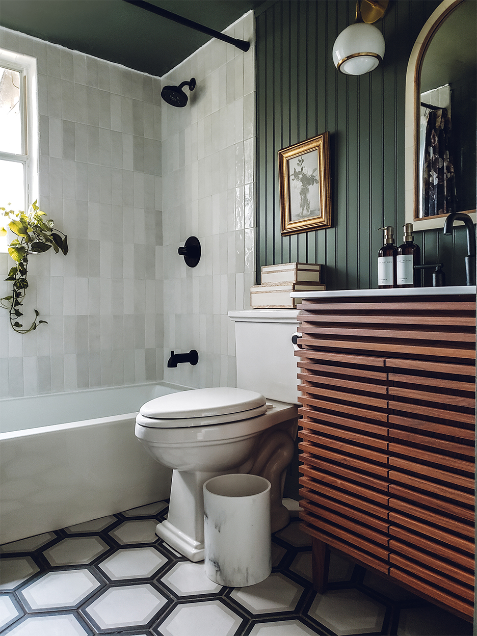 My husband and I spent a couple of hours ripping out the textured walls and putting up new drywall that we then covered in $100 worth of beadboard. I chose the material because it feels classic and fresh at the same time. We then gave the boards a coat of green paint from Clare, so the bathroom would match our home’s other moody rooms—they’re painted charcoal, black, and navy.