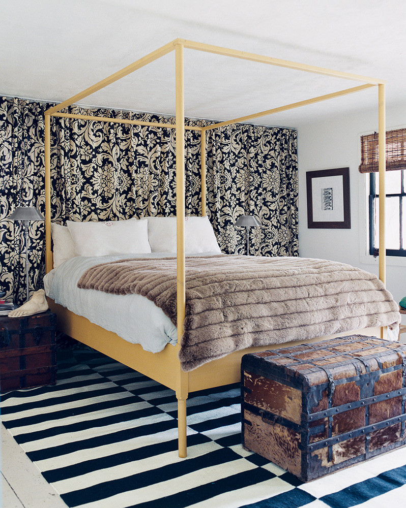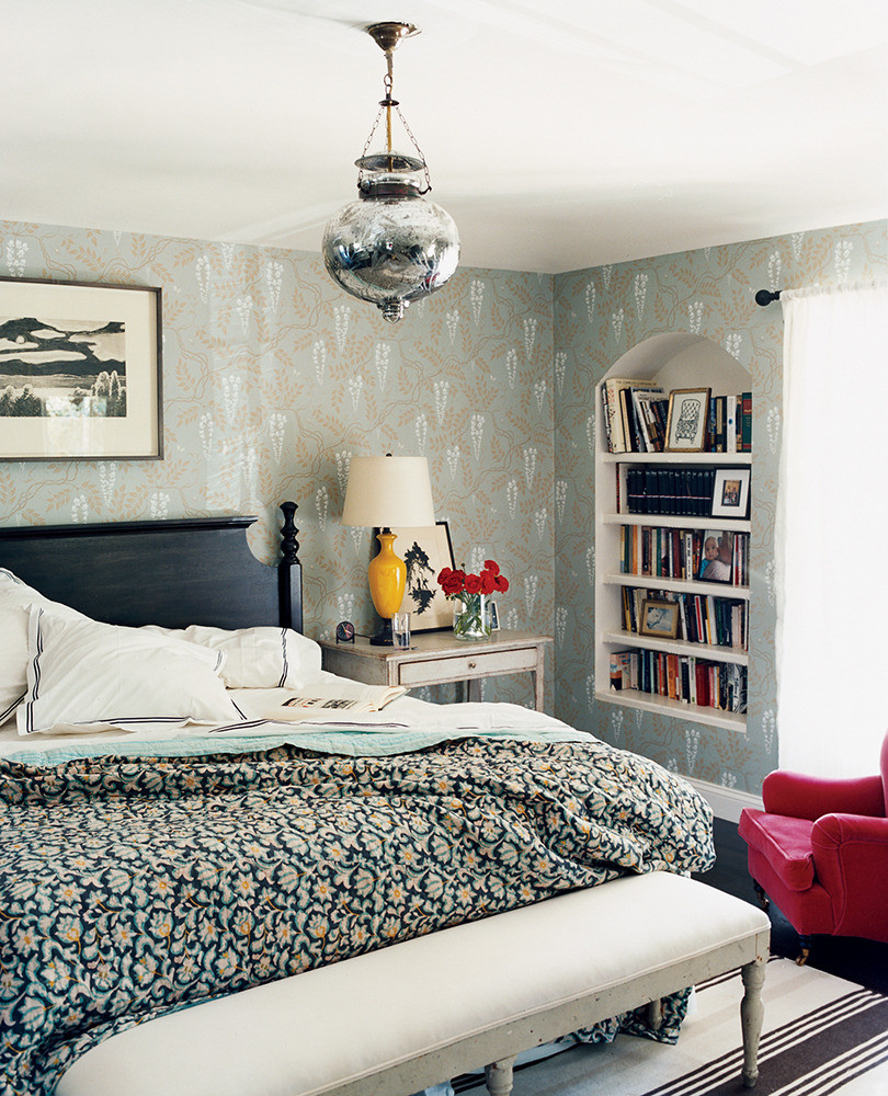 Wallpaper has always worked in the bedroom. Period. Emphasize a prominent shade or pattern by integrating it within the walls and bedding. Keep it interesting by injecting a few key items into the space in a contrasting shade.