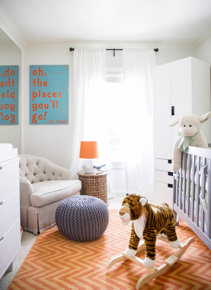 Add a refreshing touch of color to a neutral space. Turquoise and tangerine add a fresh, invigorating, and gender-neutral spin on this nursery.