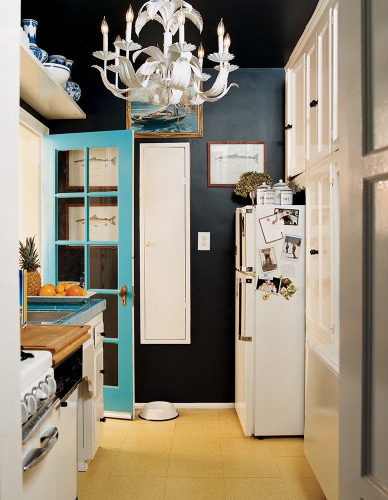 This kitchen inspires us to take risks – and we will in 2015! A bold wall color instantaneously transforms even the most humble of places. Go the extra mile and adorn the space with an eclectic chandelier.