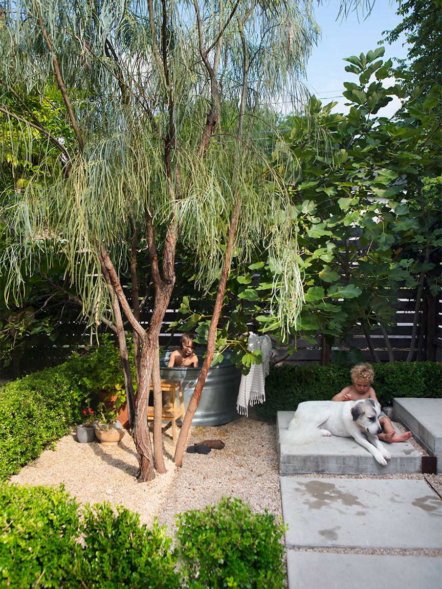 Story time now takes place in one corner of the yard, where there are two vintage Willy Guhl Loop chairs. The cement seats, paired with a blue metal side table from CB2, might not look all that comfortable, but their swooping curves provide the perfect cradle for little ones. Spitler tasked her carpenter with making two teakwood bases for the chairs in order to prop them up. Now they feel more suited for reading and morning journaling sessions than lounging poolside.