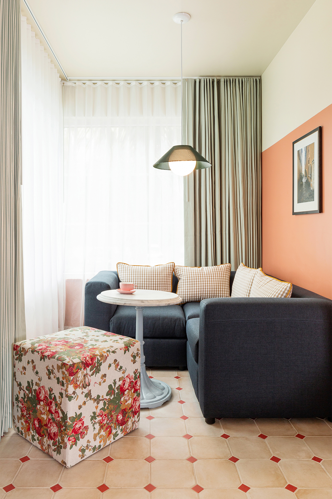 In the lobby, the building’s original terrazzo floor was painstakingly restored, but the suites feature something a little more unexpected: a coral and beige tile reminiscent of ’90s interiors. “I just wanted it to feel like you’re going to someone’s apartment in Italy and pick something that felt kind of pedestrian,” explains Brosh who channeled approachable European elegance in his flooring choice. Vintage rugs were layered on top—a nod to the hotelier’s constant efforts to make high design feel within reach.