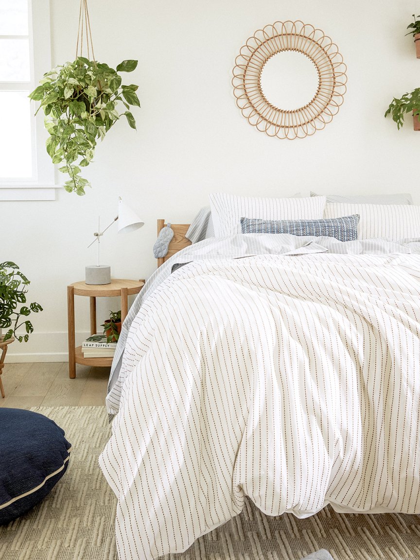 This isn’t the first time the two companies have partnered (remember their 2018 travel kit?), but it is the most extensive product line they’ve rolled out. You can get everything from striped cotton sheets to a seriously stylish denim dog bed. And since we’re spending more time than ever cooped up indoors, why not treat our homes to a plush little revamp?