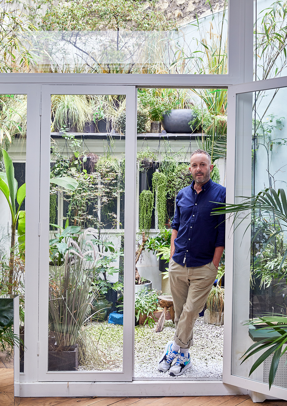 There was just one thing missing: ample natural light, which Aumas addressed by adding a skylight in the heart of the living room and floor-to-ceiling glass doors that open onto the garden. “I wanted to create a ‘little jungle’ and let the greenery spill indoors to let both spaces blend together,” he says of the purposefully overgrown outdoor space and adjoining houseplant collection.