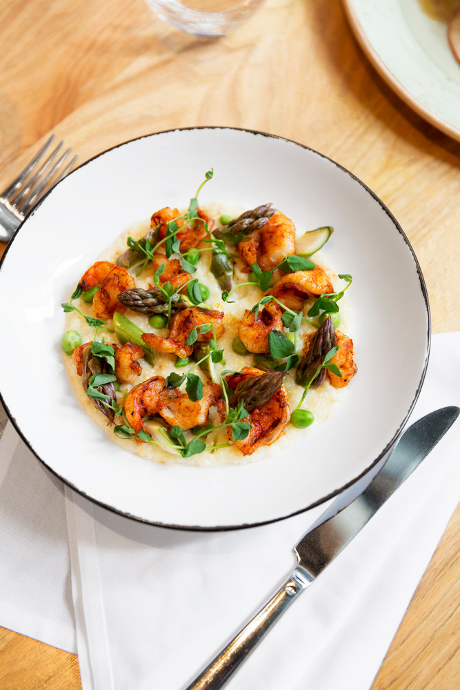 To finish: Cook shrimp on the grill or in a sauté pan until just done, they will cook very quickly. Spoon finished grits into serving vessel, top with blanched peas, pickled asparagus, shrimp and herbs.