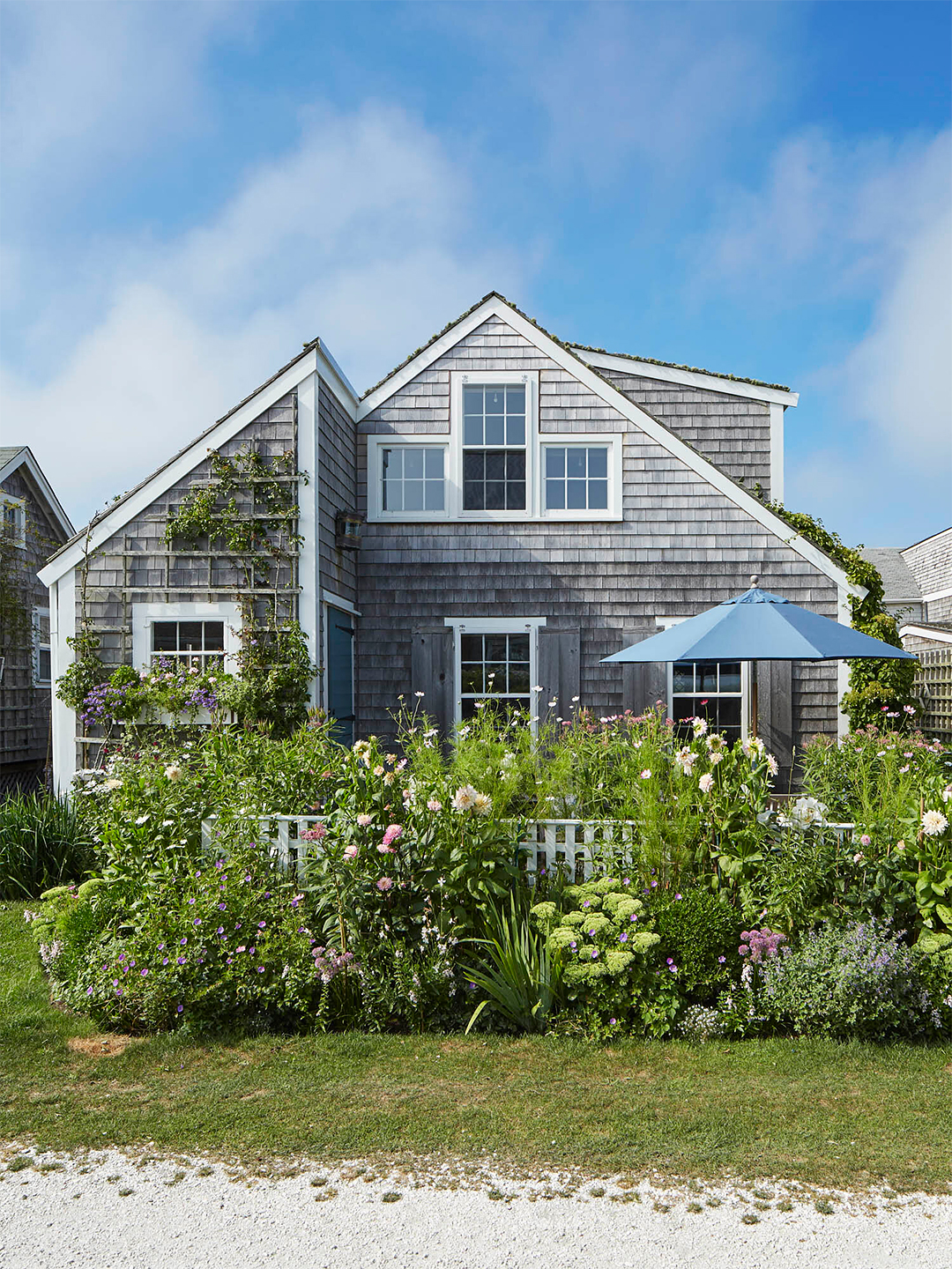 Being a STEM teacher isn’t easy, but it does come with a perk in Greg Dunbar’s case: a two-month summer vacation that allows him and his partner, Glenn Hinderstein, to leave their Los Angeles home every June and spend the season in Nantucket. The couple met on the island in 2015; Dunbar has been visiting the New England locale since he was a child, and Hinderstein, an avid sailor, spent many years on his boat in the area. After two summers spent living on Hinderstein’s sailboat, however, Dunbar craved solid ground again. They traded their sea legs for a small rose-covered, shingled cottage in Sconsett.