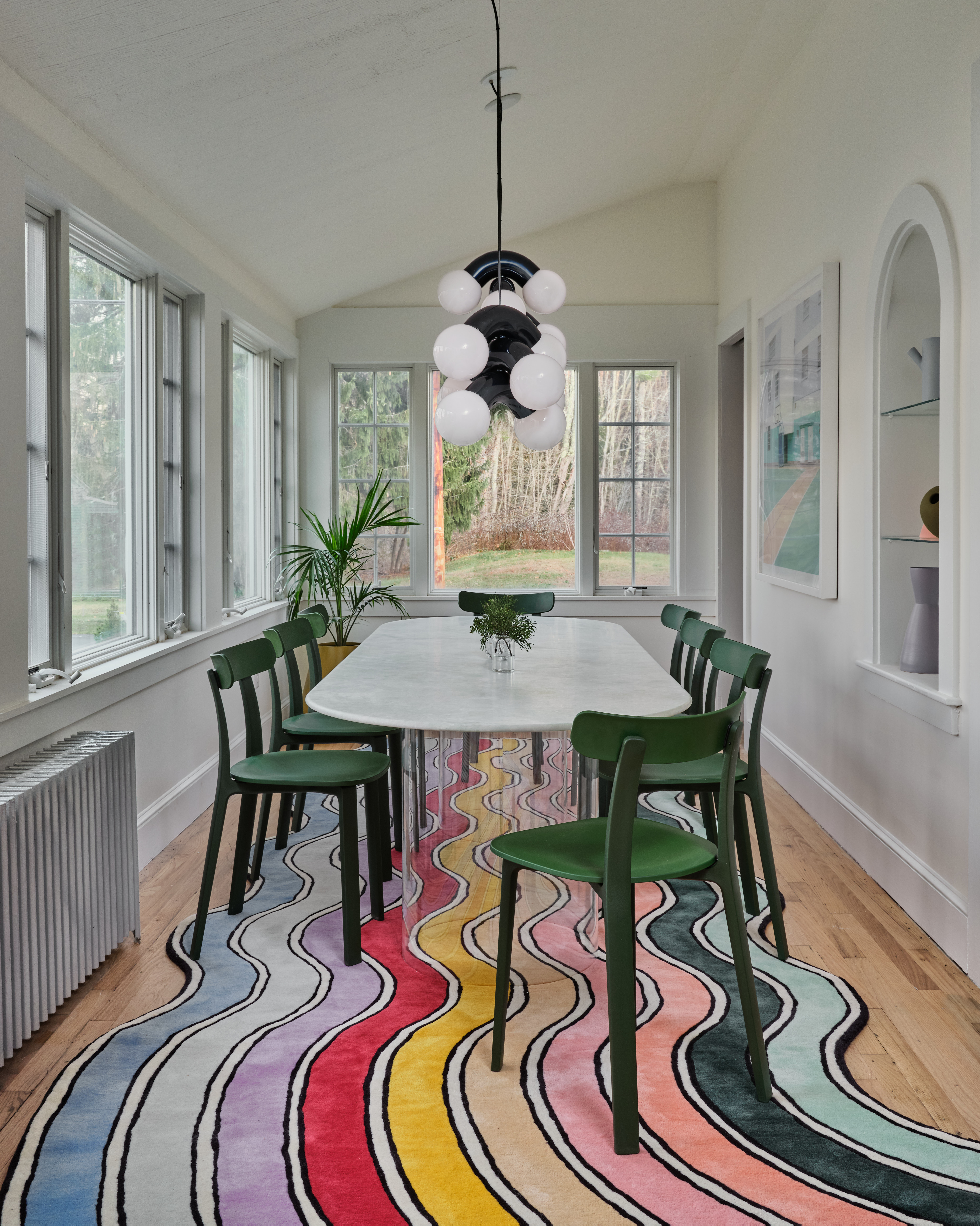 A rippling rainbow rug sounds like a design unicorn, but in a new vacation rental in Kennebunk, Maine, the carpet is all too real. The 60-foot number is the work of Pieces by An Aesthetic Pursuit, a furnishings line run by Jenny Kaplan; her husband, Chris Corrado; and their business partner, Taisha Coombs. Since launching the brand, it has become known for its bold aesthetic, which even Kaplan admits is too much for some people. So they created a space where vacationers can experience the items firsthand, then stay a little while. “We wanted to show that you can use our products in a very refined way,” says Kaplan. “It’s not necessarily kooky or crazy.”