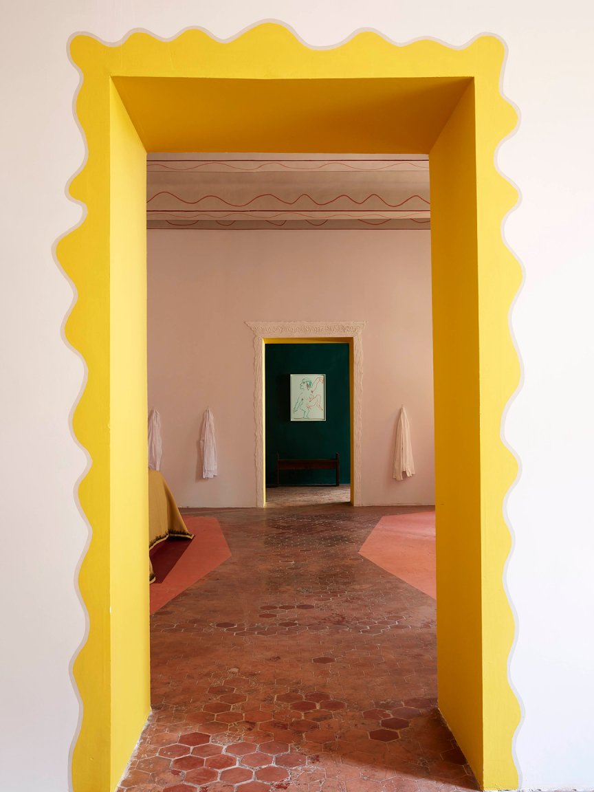 At Villa Noailles in Toulon, France, few surfaces are left unpainted: Oxblood and white paths were drawn on antique terracotta floors, and the insides of door frames were covered in bright yellow. On one side, curvy motifs create architectural interest—an easy way to spruce up a boring doorway.