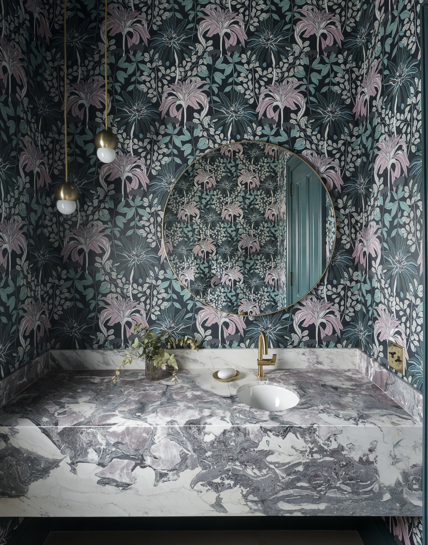 On the flip side, if you’re someone who prefers pops of pink in design, this powder room from DB Studio should be more your speed. The pink flowers in this rich wallpaper match the rosy touches of pink in the marble, showing how impactful this choice can be in a multicolored scheme.