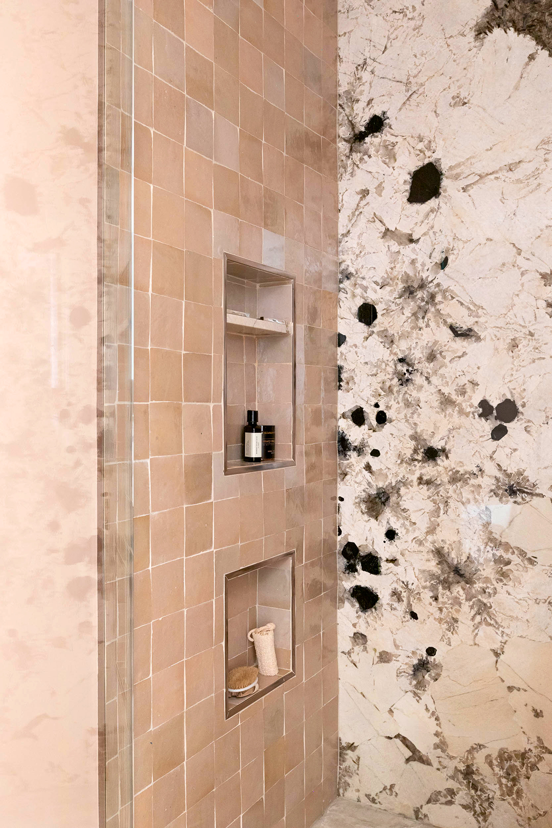 While the wet zone stayed the same width and depth, Palomino ditched to tub combo and designated the spot as a stand-alone shower. Then she turned up the volume on the drama by cladding the side walls in zellige tile from Zia Tile (a riff on the peachy pink wall paint) and swathed the back wall and partition in a quartzite called Alpine from Arizona Tile. “It looks like it has crystals inside of it,” Palomino says of the stone’s rich splotches and subtle sparkle. To keep the room from feeling overly glamorous, the designer opted for weathered concrete floors.