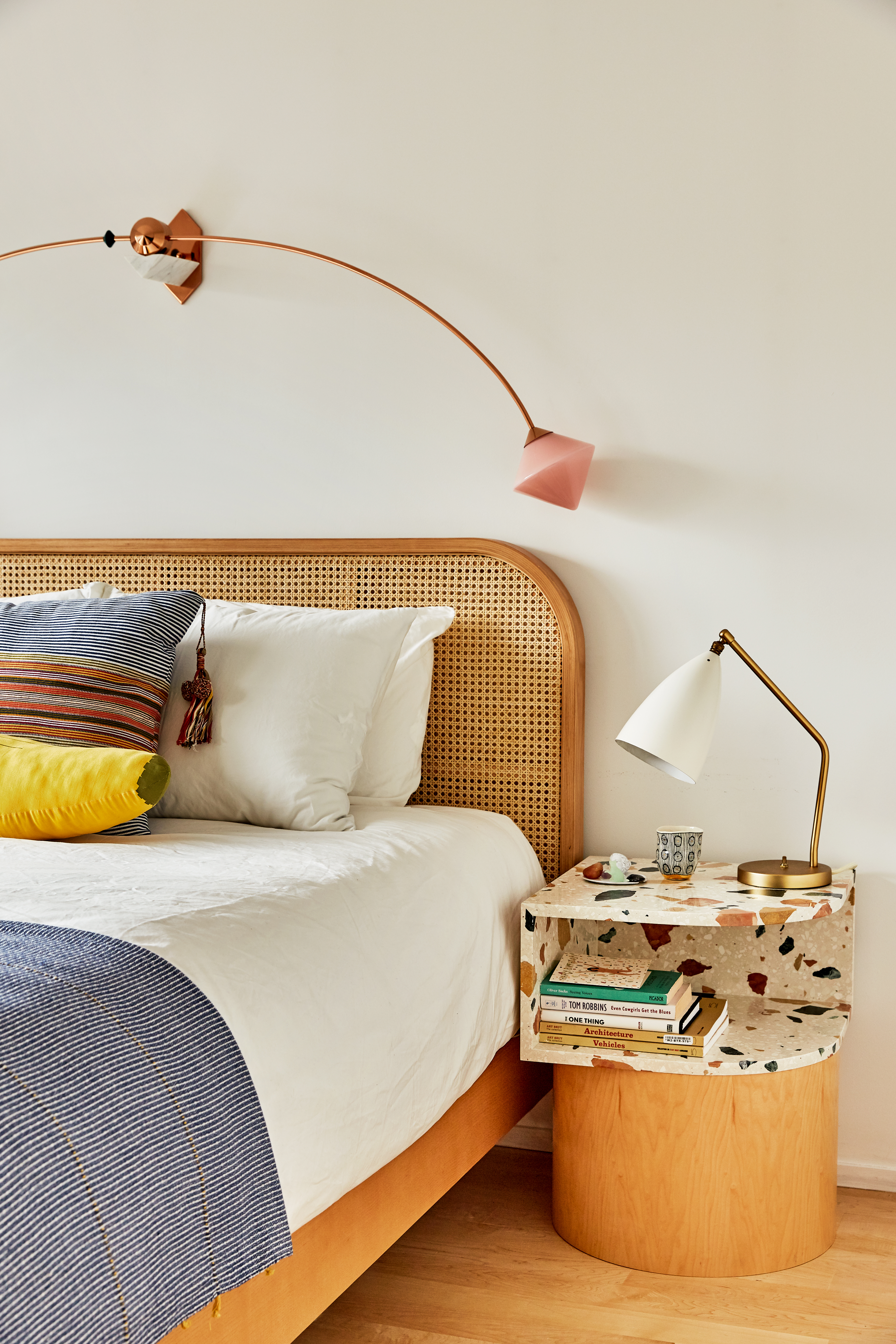Two surefire ways to add character to a space? Vibrantly patterned side tables and rattan accents. We’re swooning over Cailtin Mociun’s Brooklyn bedroom, which is filled with such happy, whimsical details.