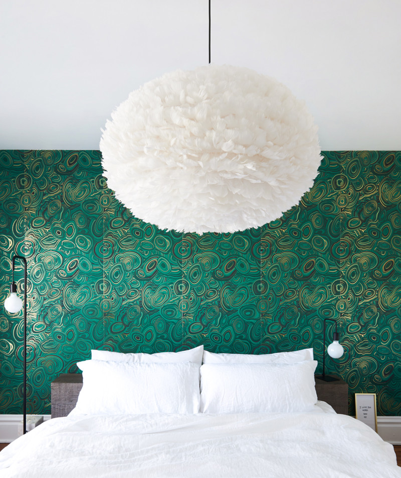 A bold malachite wallpaper steals the spotlight in Jonathan Steinitz’s colorful Columbus, Ohio, bedroom, which comes complete with an oversize cloud-like feather pendant lamp and crisp white bedding for a fresh take on a bright green scheme.