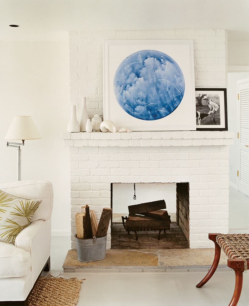Pop some color into an all-white room with a geometric piece of art. A bucket of wood near the fireplace leaves the space feeling cozy year-round. Layer in monochromic accessories, and throw down a thick seagrass rug to add texture.