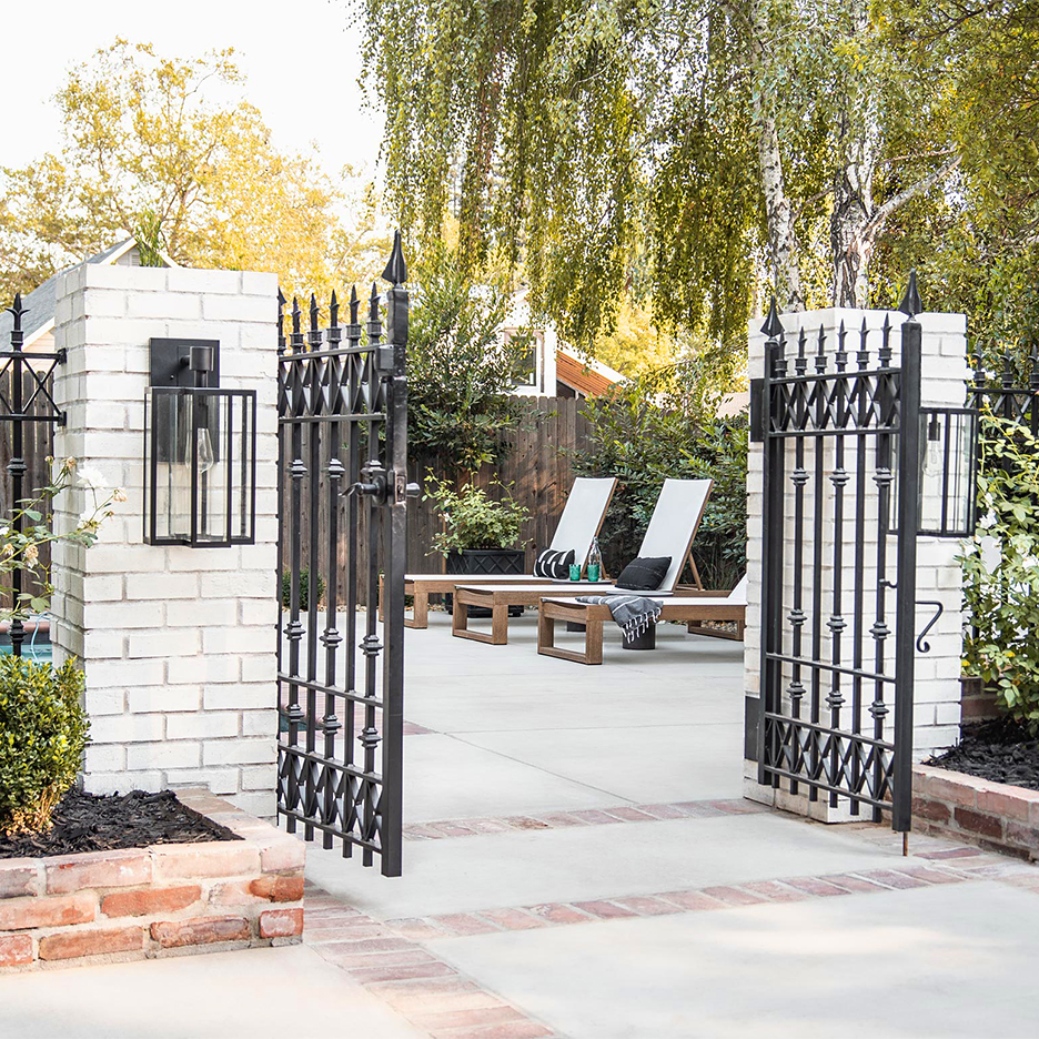 The family took a leap of faith when Valencia and Dobrinski suggested painting the formerly taupe-gray garage all black. “We felt really strongly it would tie everything together,” explains Valencia. The dramatic hue, Iron Ore by Sherwin-Williams, did just the trick, complementing the other high-contrast elements in the backyard, like the bed of white roses and the wrought-iron fence (custom designed by Dobrinski).