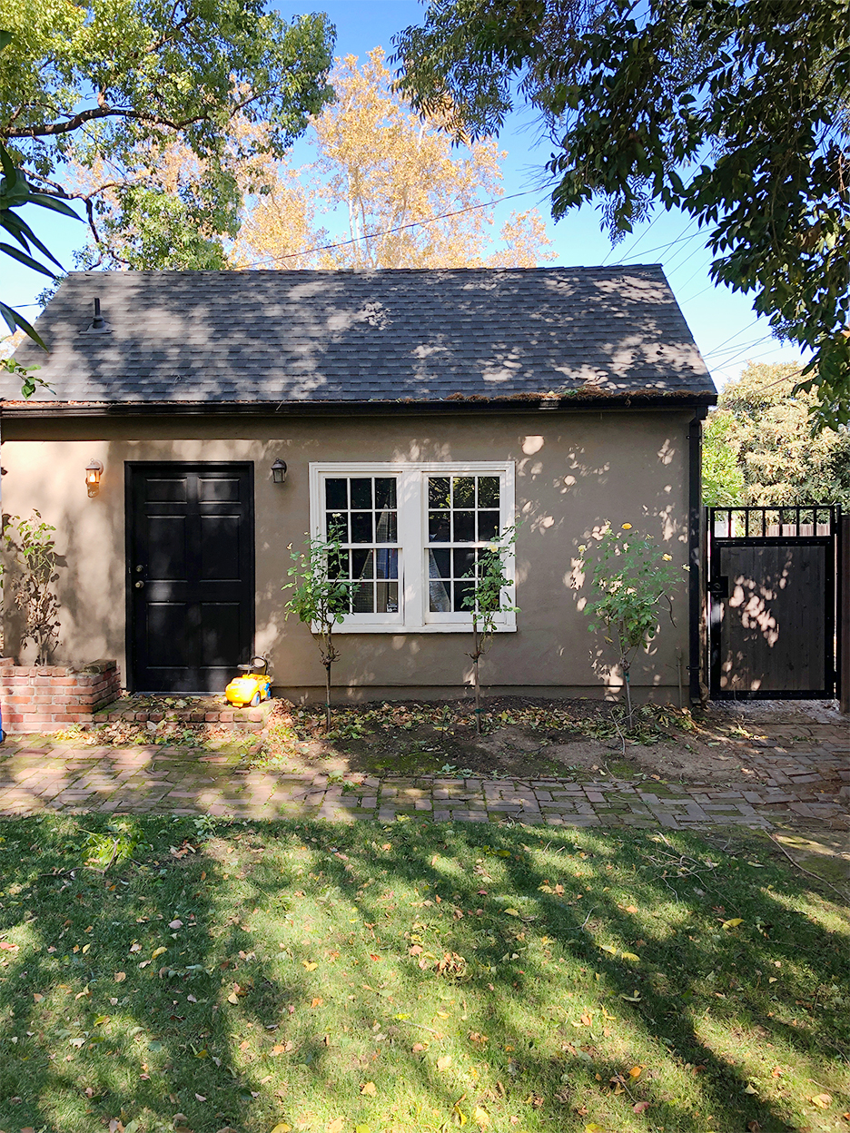 After figuring out a solution for the massive drainage issues (Dobrinski and Valencia had the ground leveled with lots of dirt to draw rainwater away from the house), the vision for the outdoor revamp quickly evolved from carving out a dining area to adding a pool and turning the old dilapidated garage into a play/work/guest house. “Because our summers are really hot, if you’re going to invest in anything in your backyard, that’s essential,” says Valencia. Here’s how they took the space from unusable to the envy of the neighborhood.