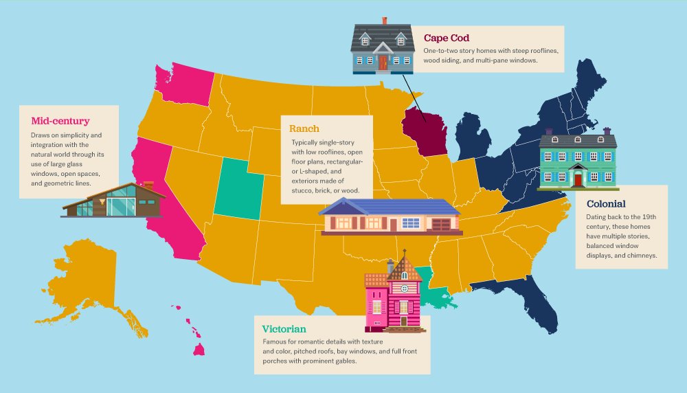 This is all well and good, but how easy is it to find these popular architectural styles, really? Despite the majority preference for craftsman-style homes, Trulia found that ranch homes are actually far more prevalent in the majority of the country. This is followed by colonial homes, which appear particularly common in the Northeast and Florida. Mid-century and Victorian are tied for third place, each taking the top spot in two states. And Cape Cod is the least popular architectural style of the top five, winning over only Wisconsin, dominantly.
