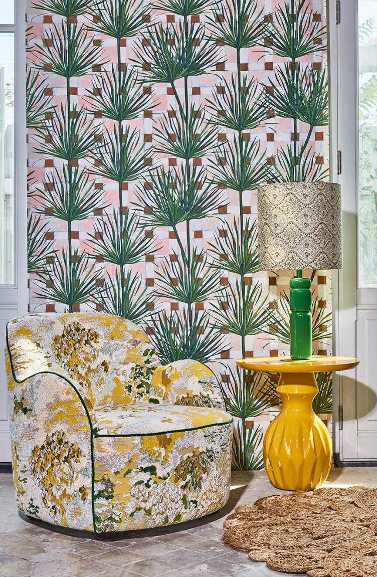 Within the 42-piece collection, spanning from lamps to dinnerware to poufs, there isn’t a sharp corner in sight. Just when I thought I was ready to say goodbye to the curvy ’70s trend that has characterized millennial style, Popus Editions makes rounded edges feel fresh again. That might have something to do with the jacquard fabric offerings in classic-with-a-twist patterns like chinoiserie and palm leaves from such iconic fabric houses as Pierre Frey and Dedar. Both the graphic and solid pieces are as successful as a single focal point as they are when mixed and matched together—there are endless combinations.