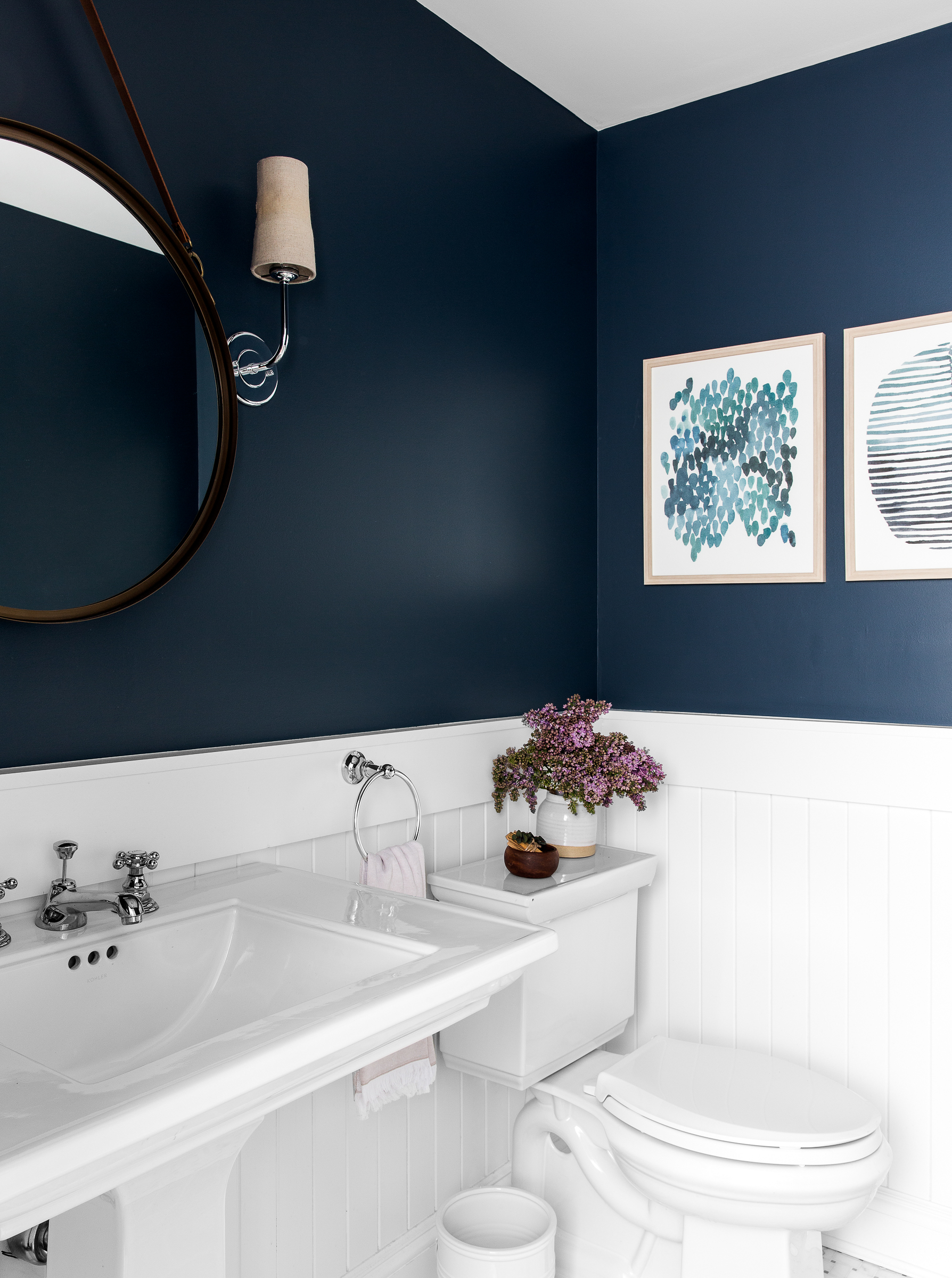 In the first-floor powder room—a space which, before the renovation, did not exist—Shea went navy but kept the overall design similarly clean with white paneling and all-marble flooring.“I always run through each case scenario for the bathroom with a client: Is this a bathroom for guests? For you and your husband? For your kids? Asking these questions in the beginning will help define a road map in terms of what materials should be used,” says Shea. In low-traffic areas like this one, pricier stones such as marble will hold up over time.