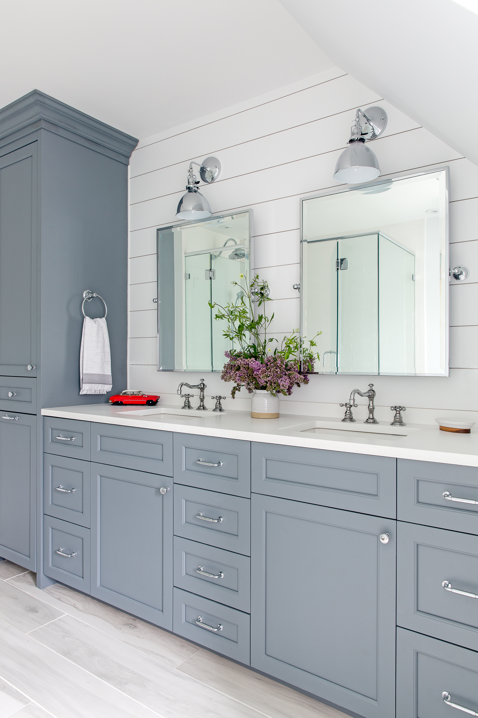 “All the bathrooms were outdated with ’80s flair—Pepto pink in one of them,” designer Becky Shea recalls of the dire state of this now-breezy home in Port Washington, New York. “The overall energy after we opened everything up made the space feel 10 times bigger and drenched with light.”